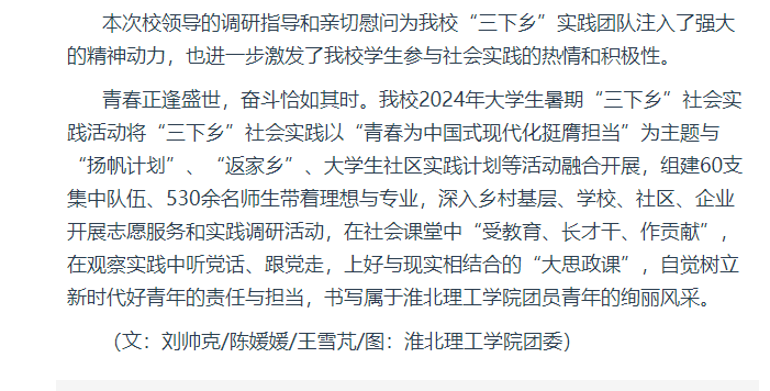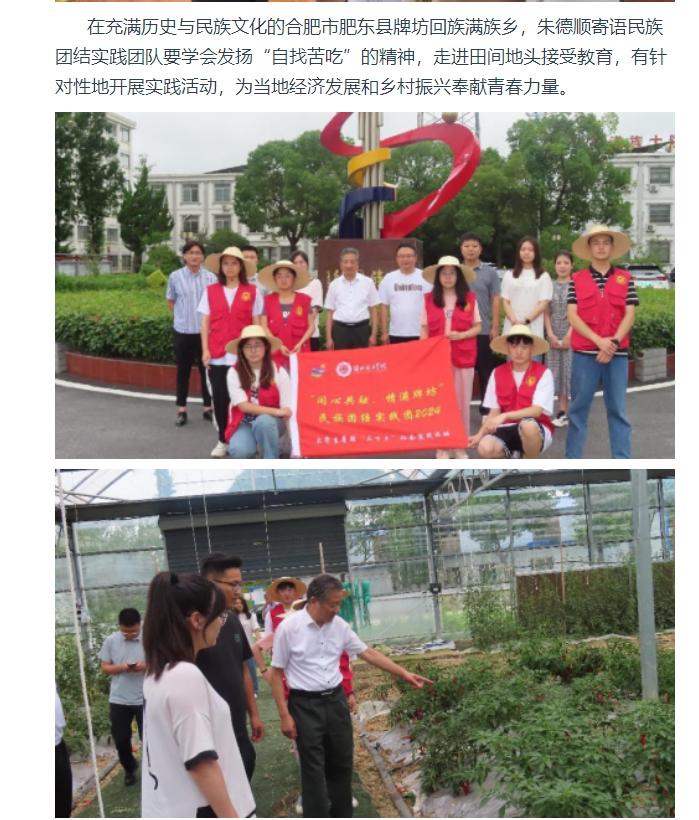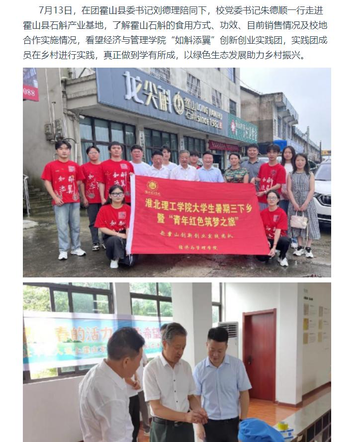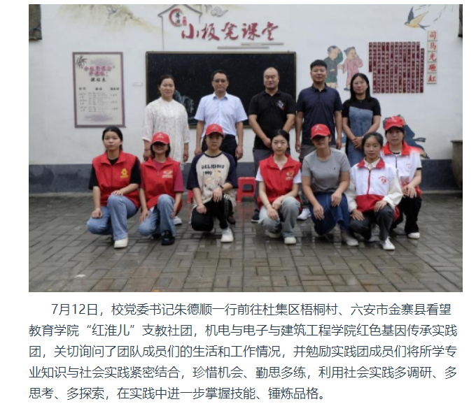伟德国际victor1946官网大学生暑期“三下乡”社会实践活动启动以来,学校团员青年在各团队指导教师带领下奔赴祖国各地开展实践服务活动。为了切实了解伟德暑期社会实践开展情况,7月9日至13日,校党委书记朱德顺、副校长郑来纪分别前往淮北市、六安市、合肥市等地,看望慰问社会实践团队师生,调研指导实践工作,进一步推进校地合作。学生处、校团委相关职能部门负责人陪同慰问。对此,中国网进行了报道: