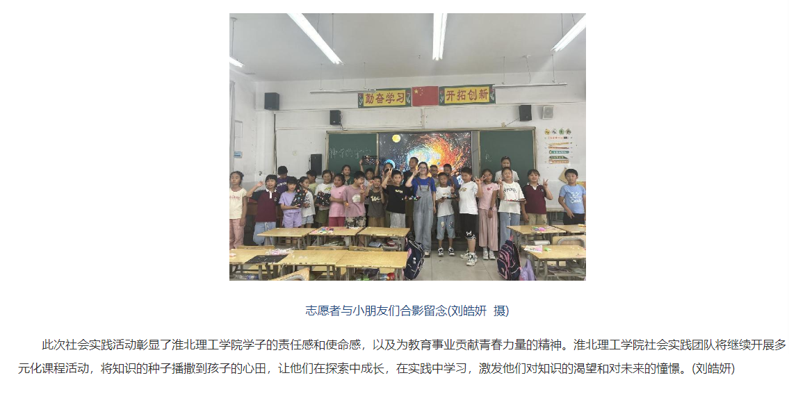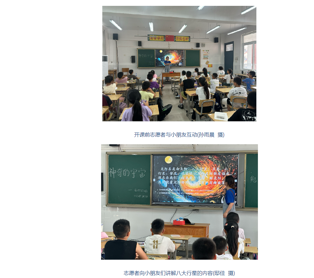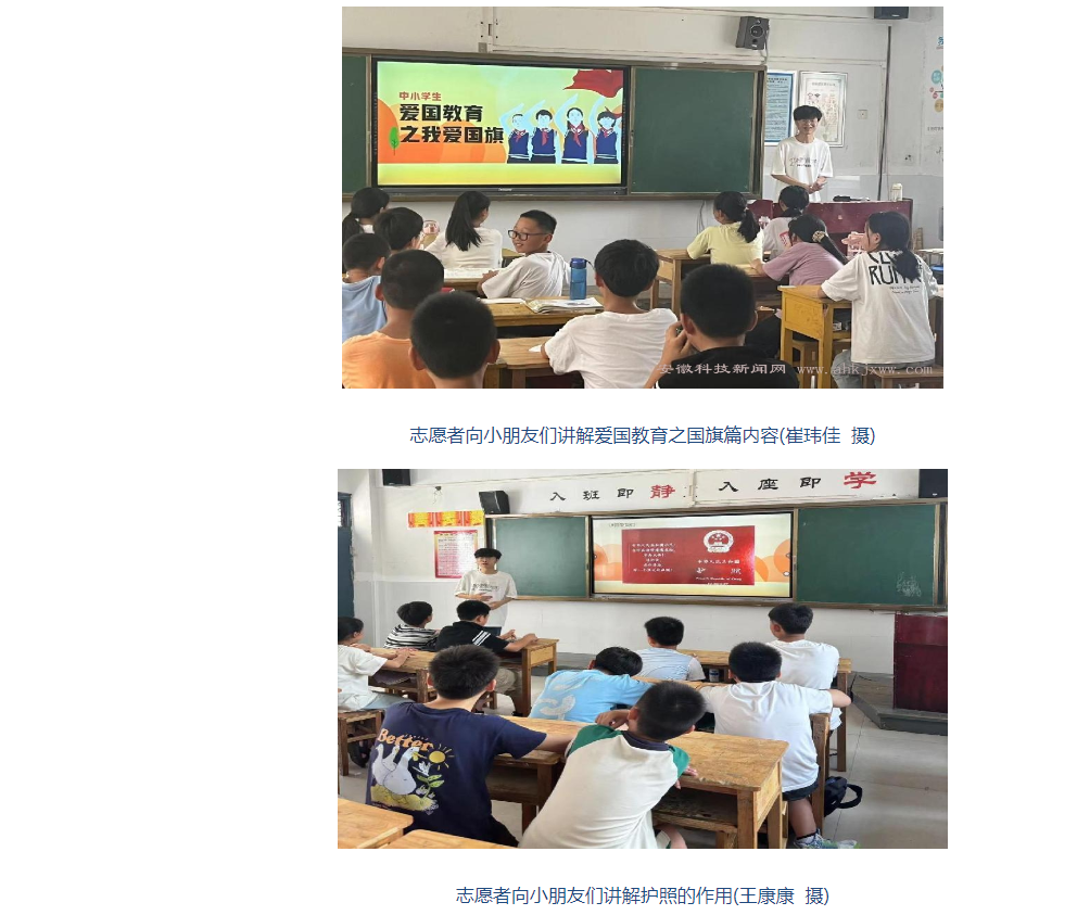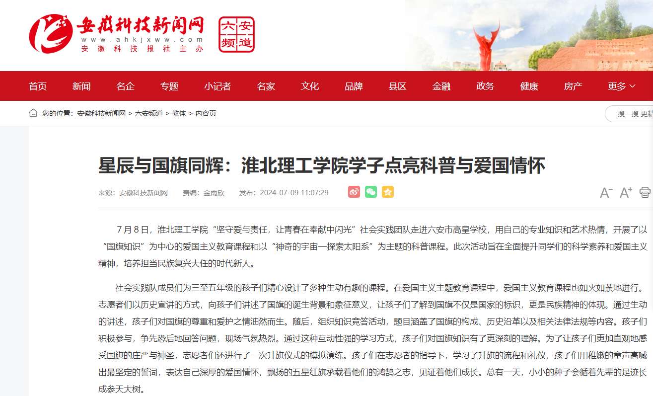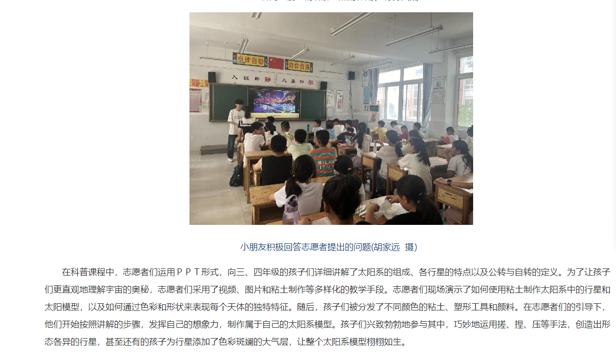 7月8日,伟德国际victor1946官网“坚守爱与责任,让青春在奉献中闪光”社会实践团队走进六安市高皇学校,用自己的专业知识和艺术热情,开展了以“国旗知识”为中心的爱国主义教育课程和以“神奇的宇宙—探索太阳系”为主题的科普课程。此次活动旨在全面提升同学们的科学素养和爱国主义精神,培养担当民族复兴大任的时代新人。对此,安徽科技新闻网进行了报道: