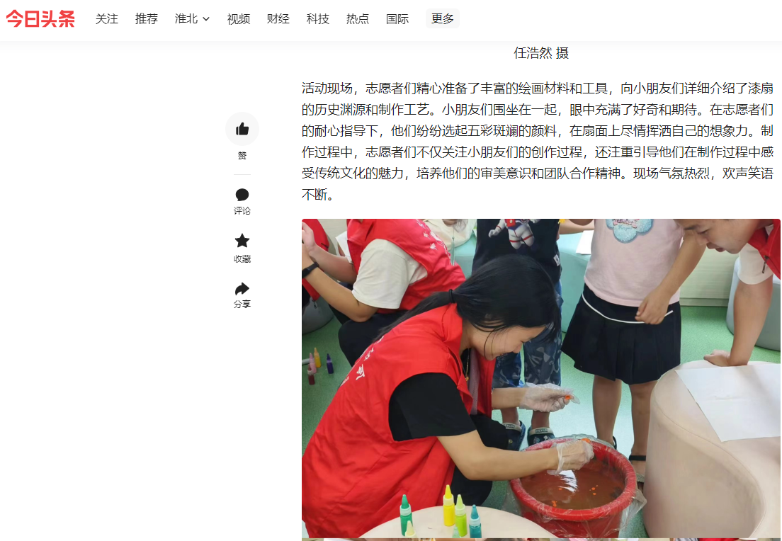文化传承,童心闪耀。2024 年 7 月 10 日,六安高店社区迎来了一群充满活力与爱心的大学生志愿者,他们带着传承和创新的使命,走进社区,走进这片充满活力的土地,为小朋友们带来了非遗漆扇的精彩课程,共同绘制出一幅充满童趣与文化交融的绚丽画卷。对此,今日头条进行了报道: