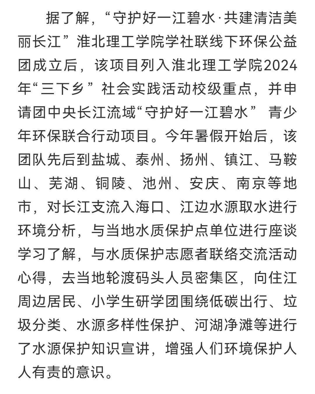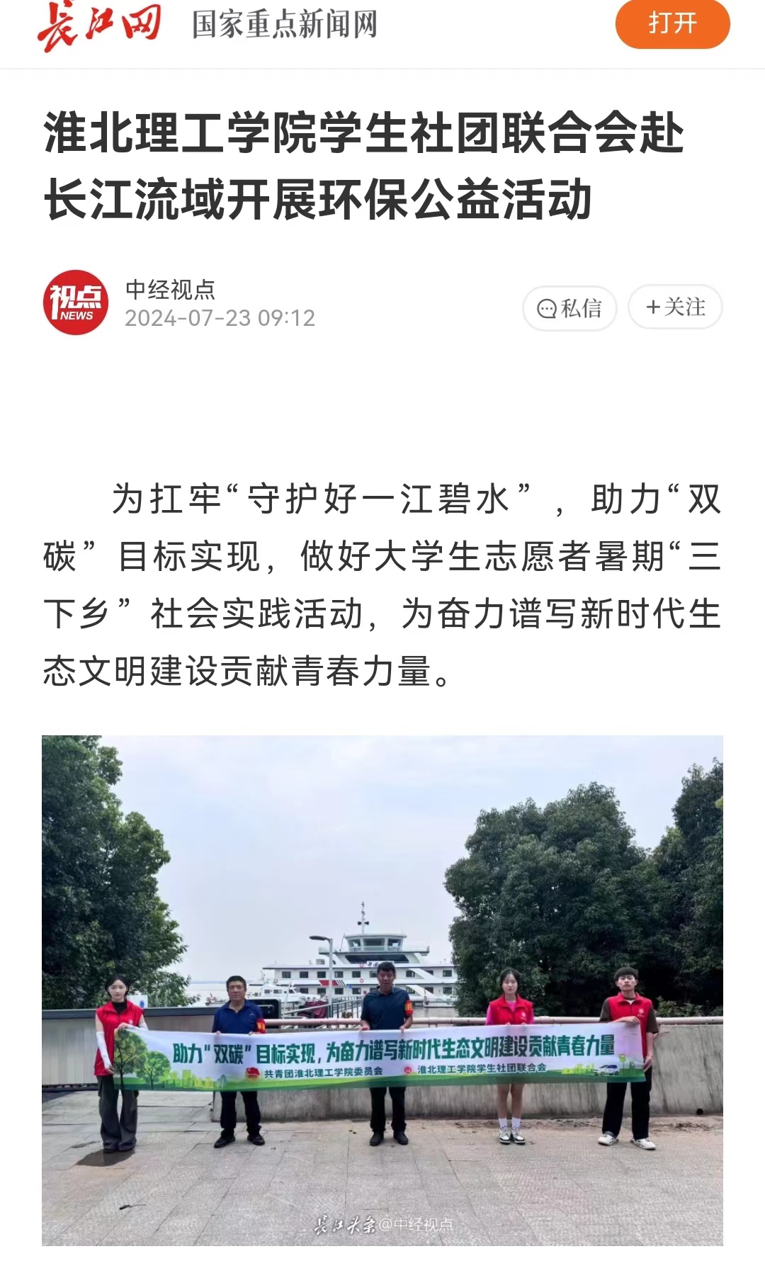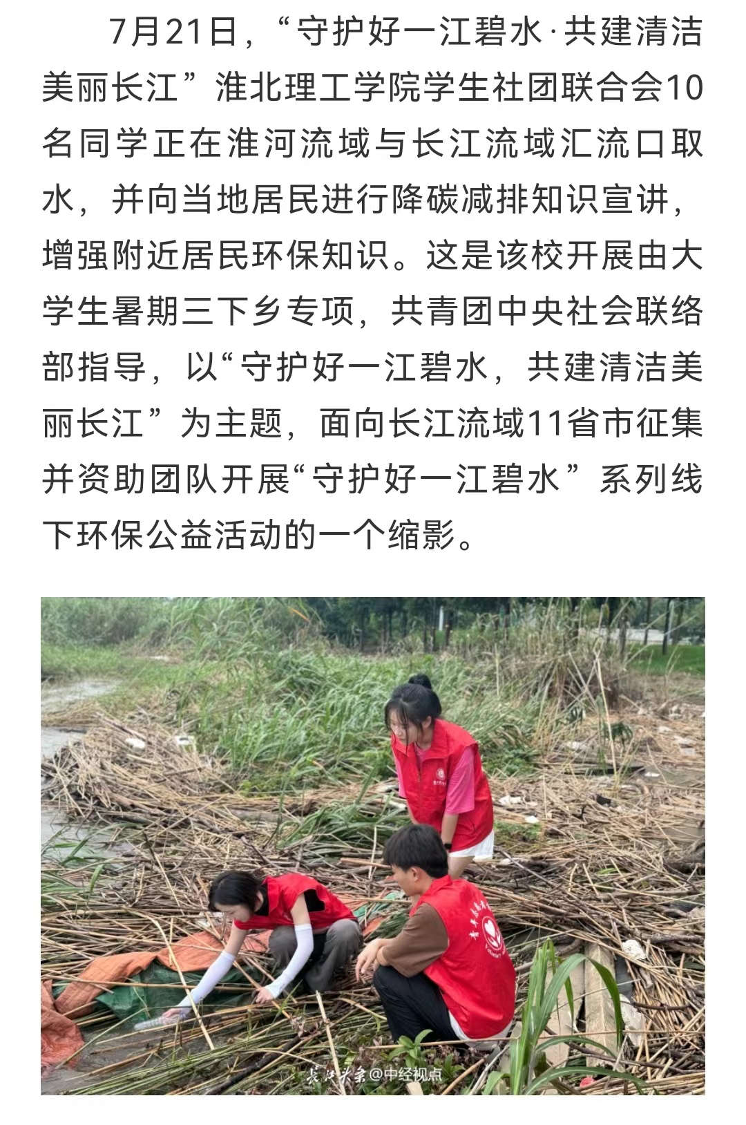 7月21日,“守护好一江碧水·共建清洁美丽长江”伟德国际victor1946官网学生社团联合会10名同学正在淮河流域与长江流域汇流口取水,并向当地居民进行降碳减排知识宣讲,增强附近居民环保知识。这是该校开展由大学生暑期三下乡专项,共青团中央社会联络部指导,以“守护好一江碧水,共建清洁美丽长江”为主题,面向长江流域11省市征集并资助团队开展“守护好一江碧水”系列线下环保公益活动的一个缩影。对此,长江网进行报道: