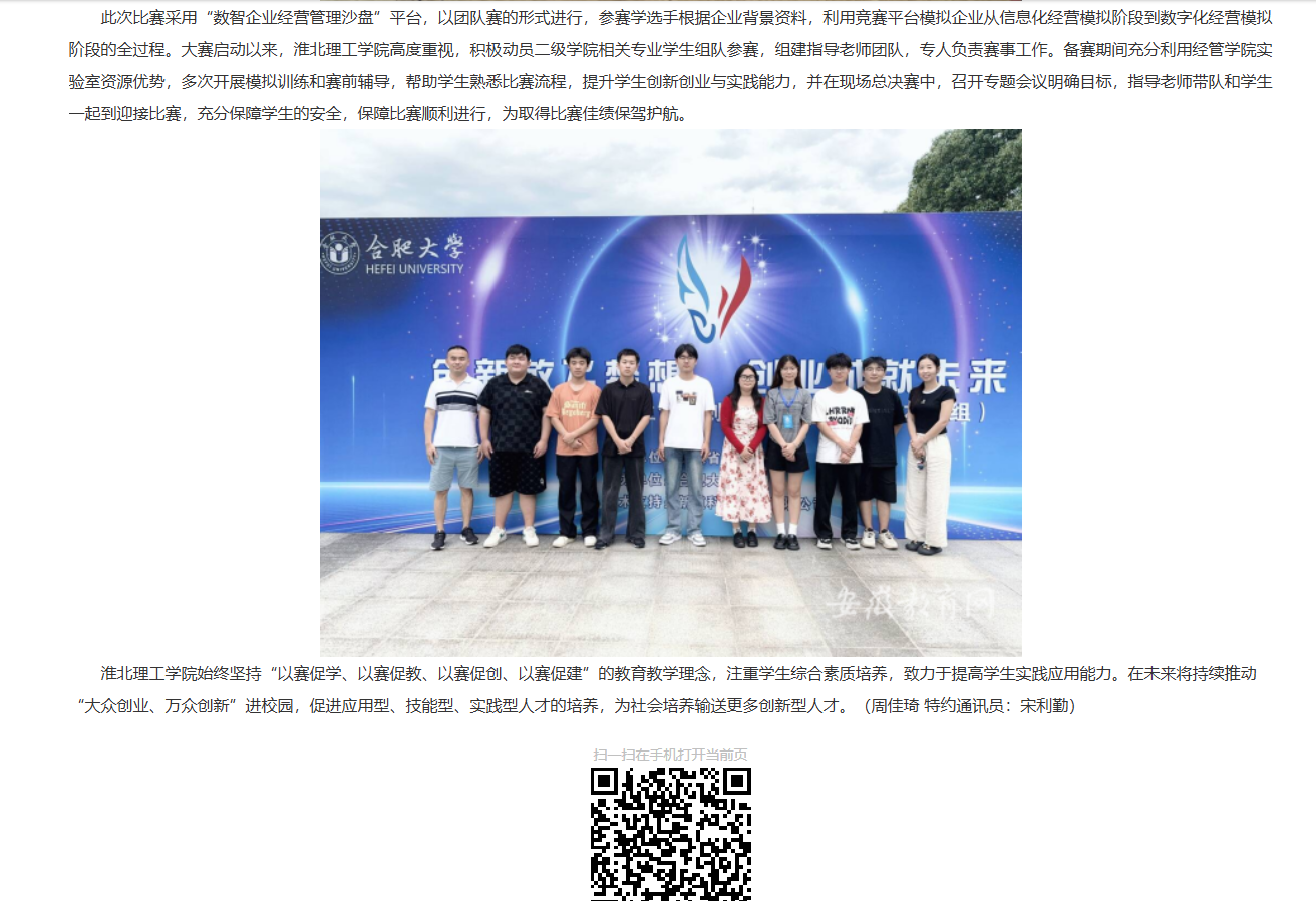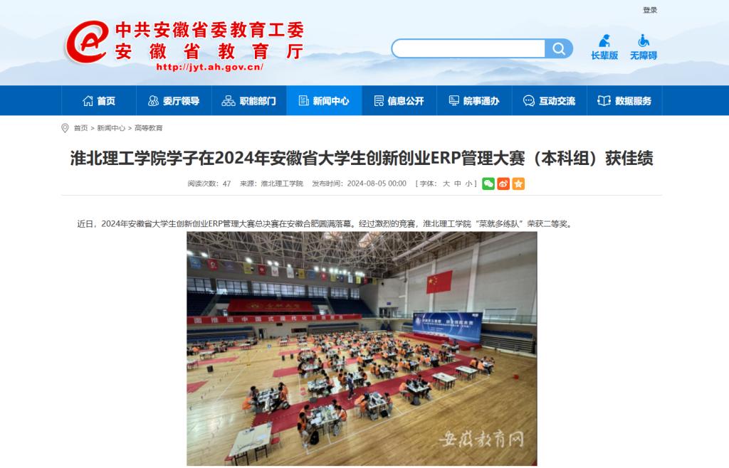近日,2024年安徽省大学生创新创业ERP管理大赛总决赛在安徽合肥圆满落幕。经过激烈的竞赛,伟德国际victor1946官网“菜就多练队”荣获二等奖。对此,安徽教育网进行了报道:
