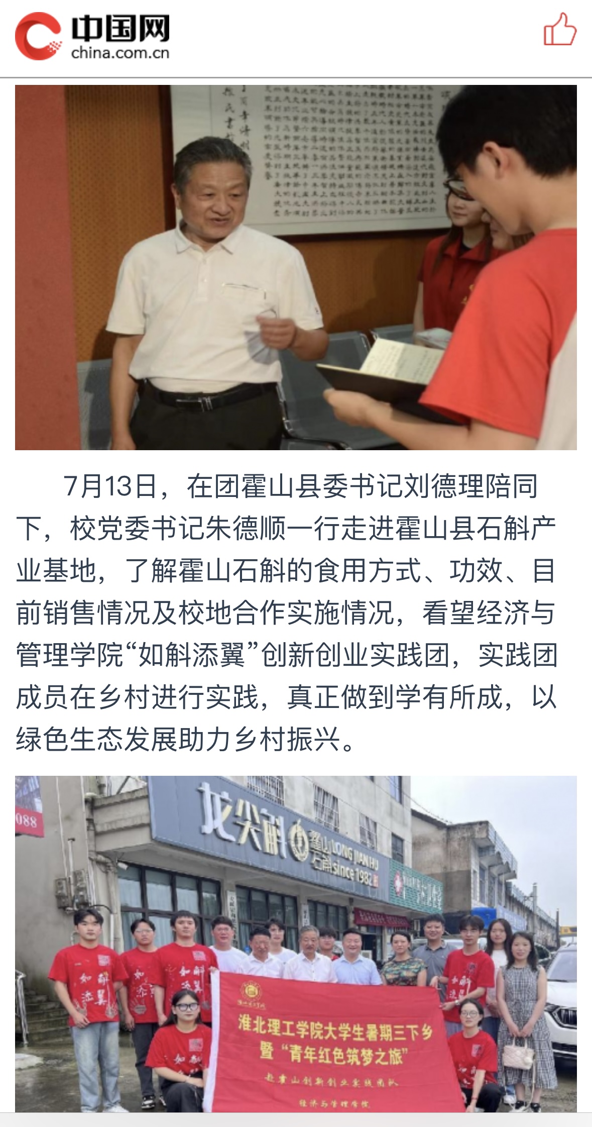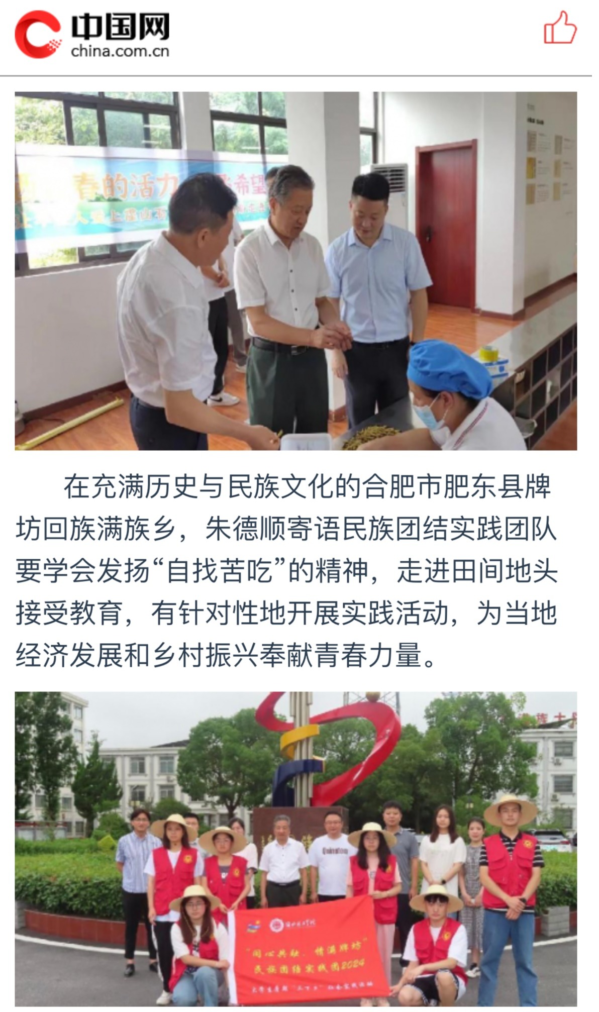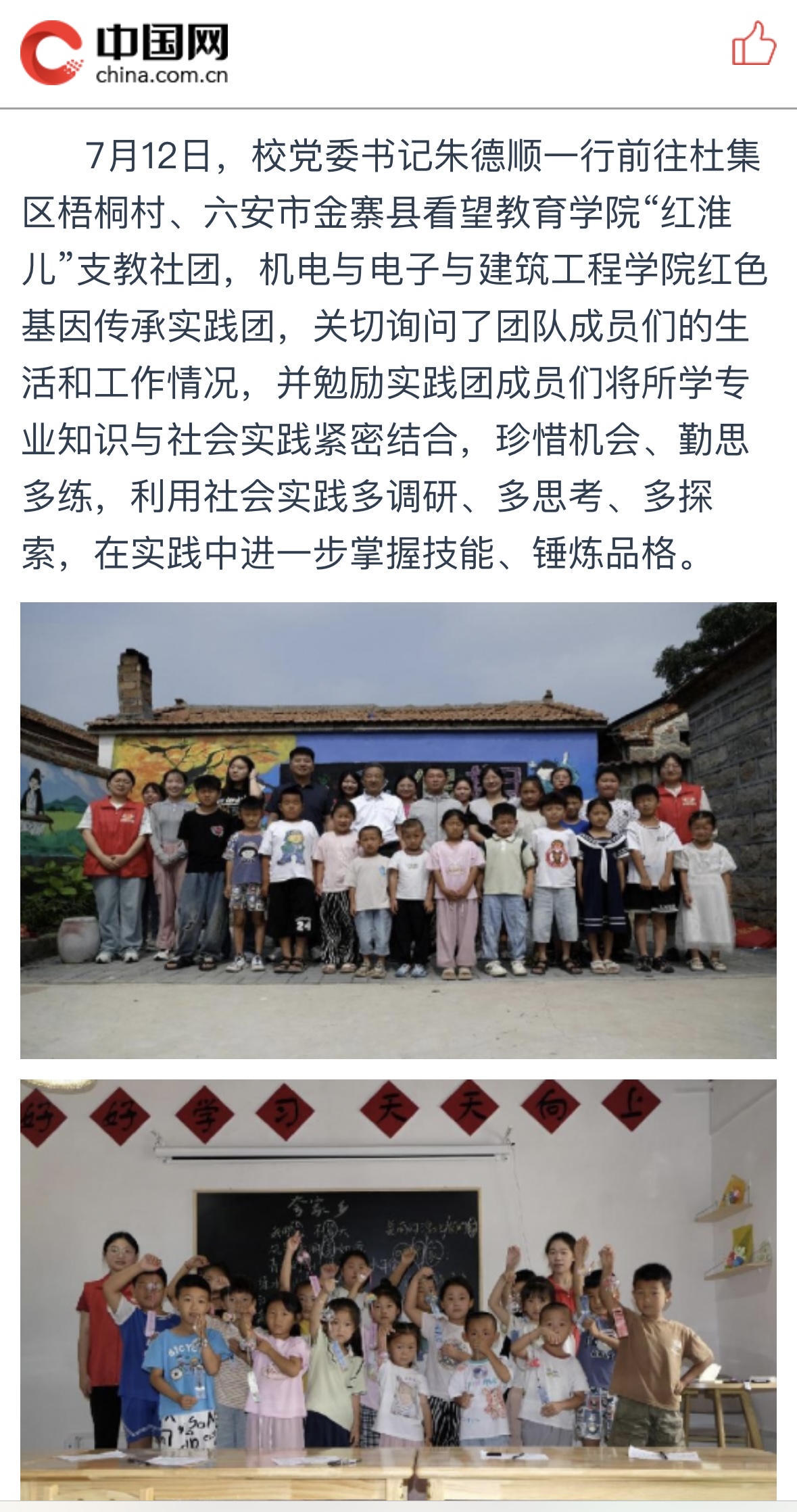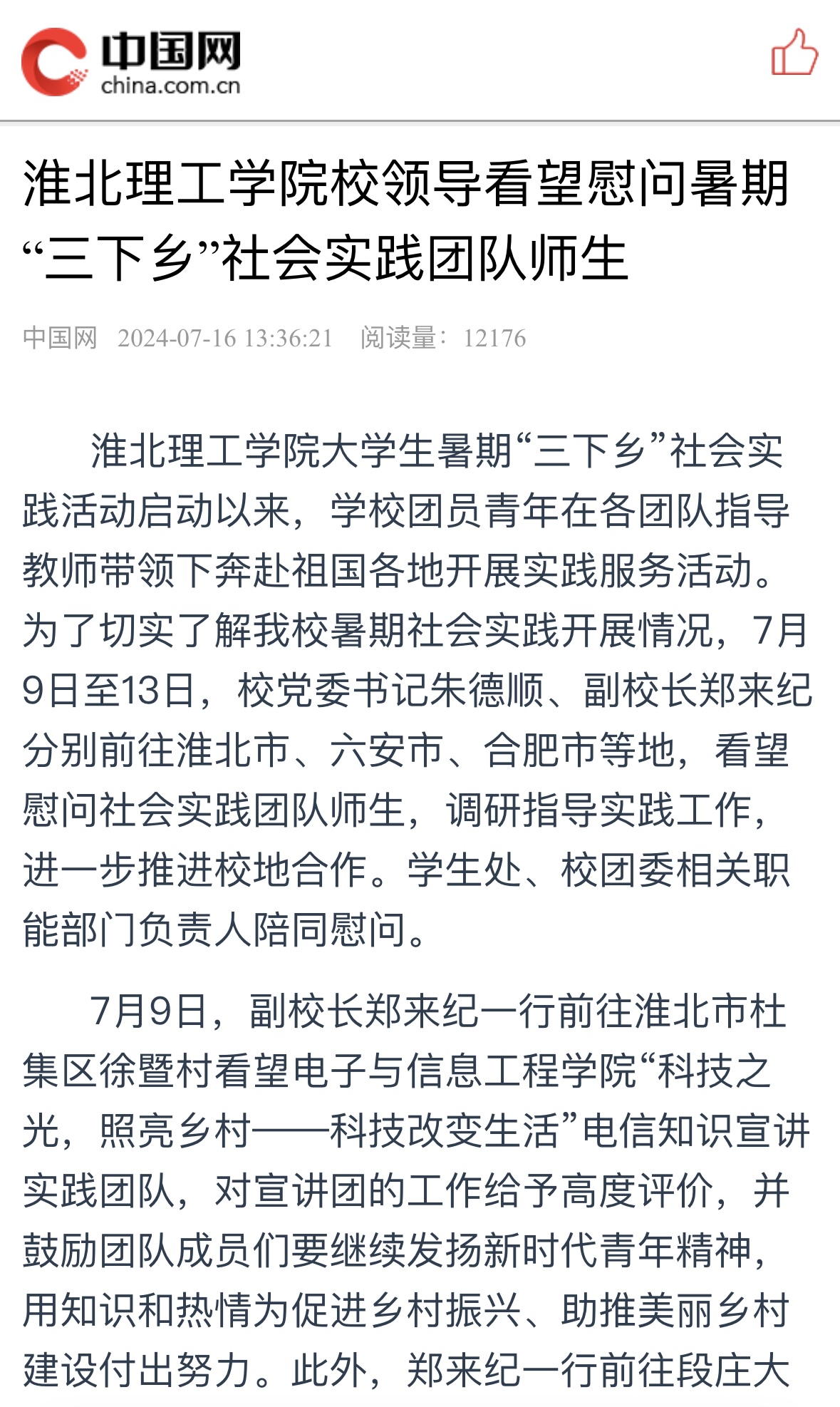 伟德国际victor1946官网大学生暑期“三下乡”社会实践活动启动以来,学校团员青年在各团队指导教师带领下奔赴祖国各地开展实践服务活动。为了切实了解伟德暑期社会实践开展情况,7月9日至13日,校党委书记朱德顺、副校长郑来纪分别前往淮北市、六安市、合肥市等地,看望慰问社会实践团队师生,调研指导实践工作,进一步推进校地合作。学生处、校团委相关职能部门负责人陪同慰问。对此,中国网进行了报道:
