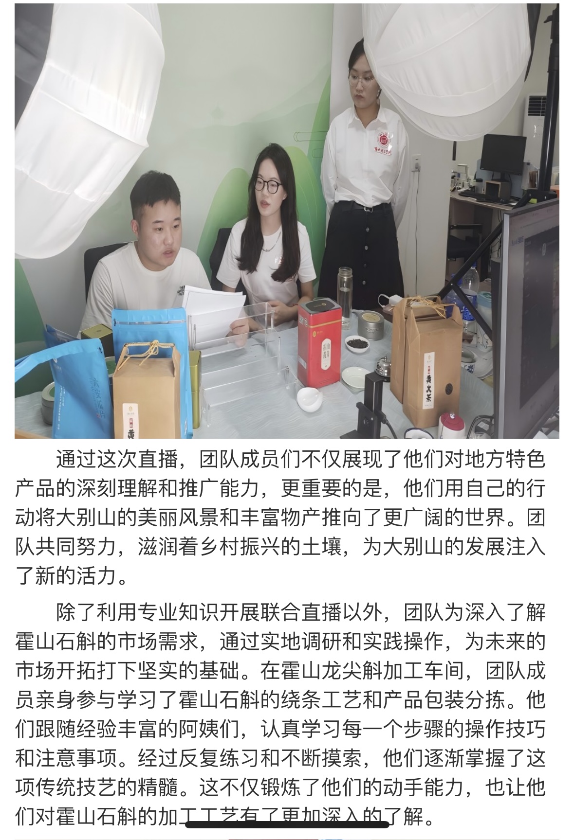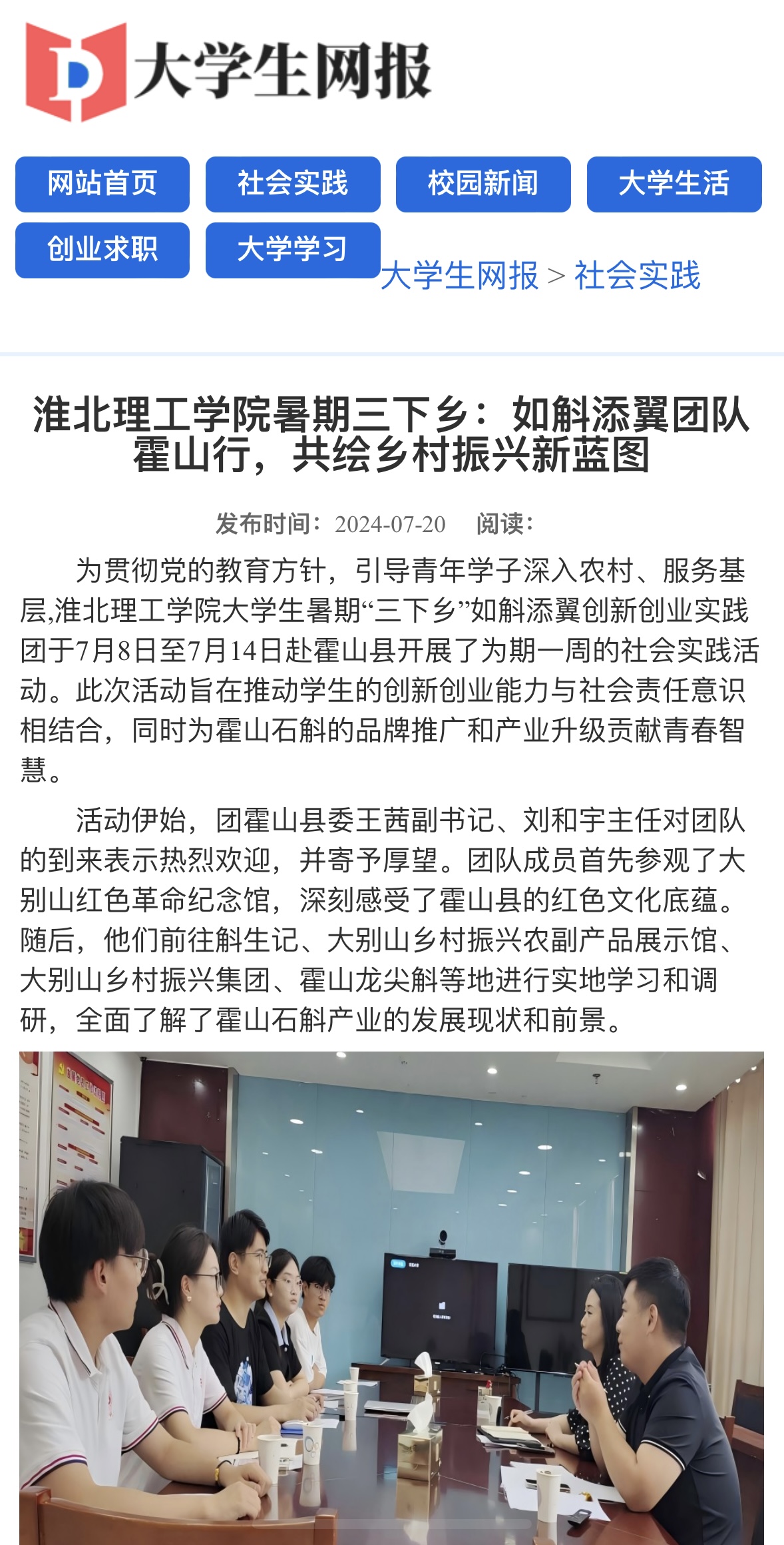 为贯彻党的教育方针,引导青年学子深入农村、服务基层,伟德国际victor1946官网大学生暑期“三下乡”如斛添翼创新创业实践团于7月8日至7月14日赴霍山县开展了为期一周的社会实践活动。此次活动旨在推动学生的创新创业能力与社会责任意识相结合,同时为霍山石斛的品牌推广和产业升级贡献青春智慧。对此,大学生网报进行了报道: