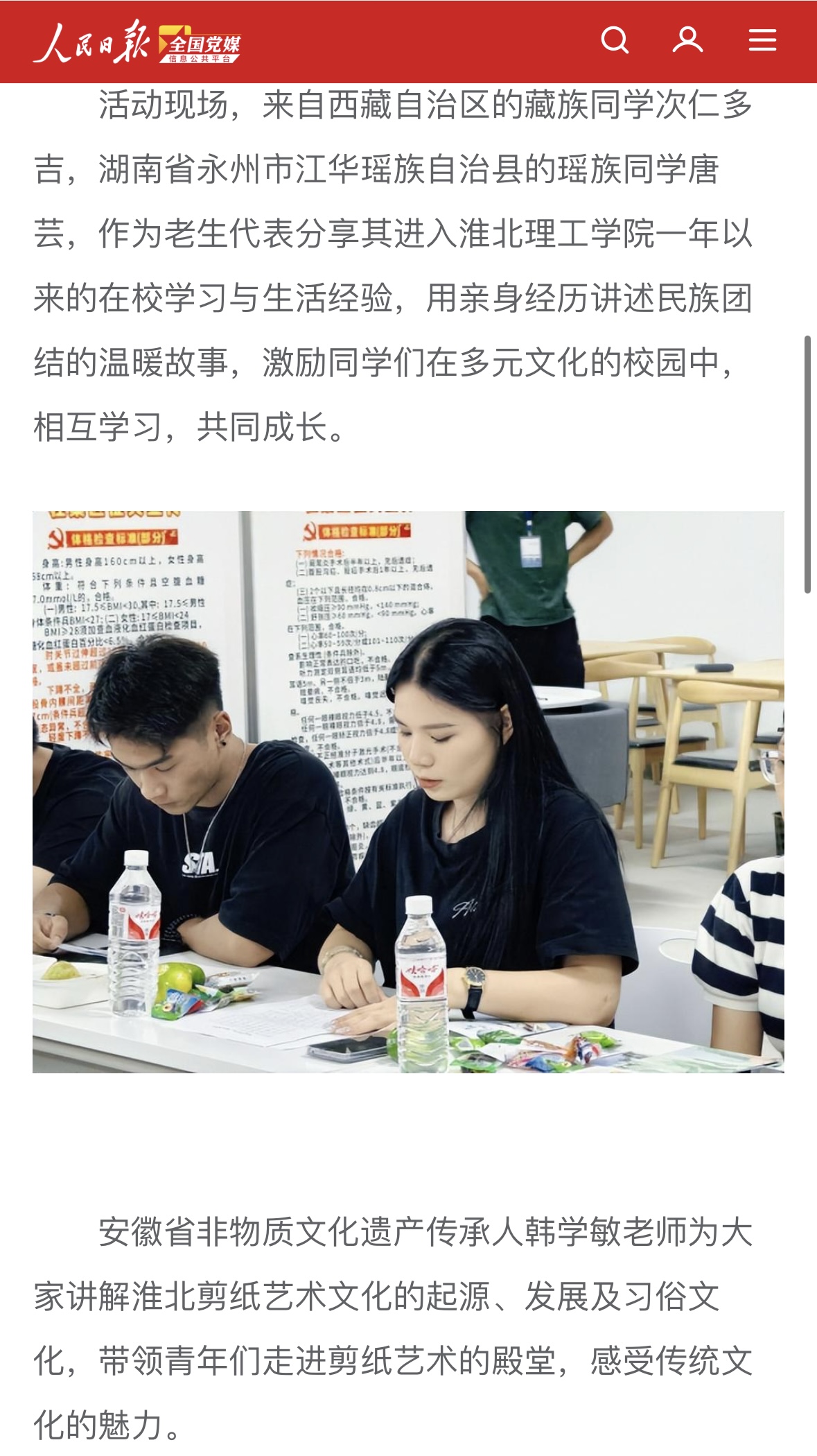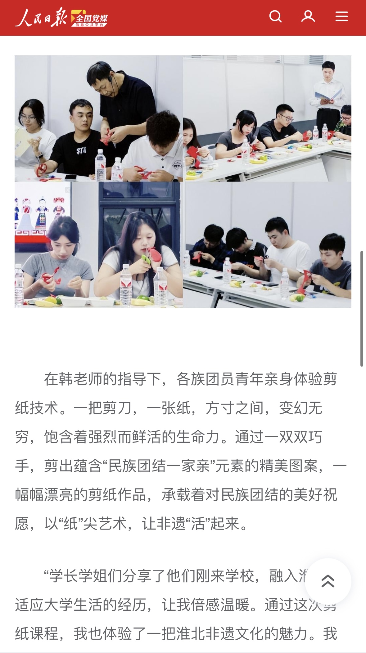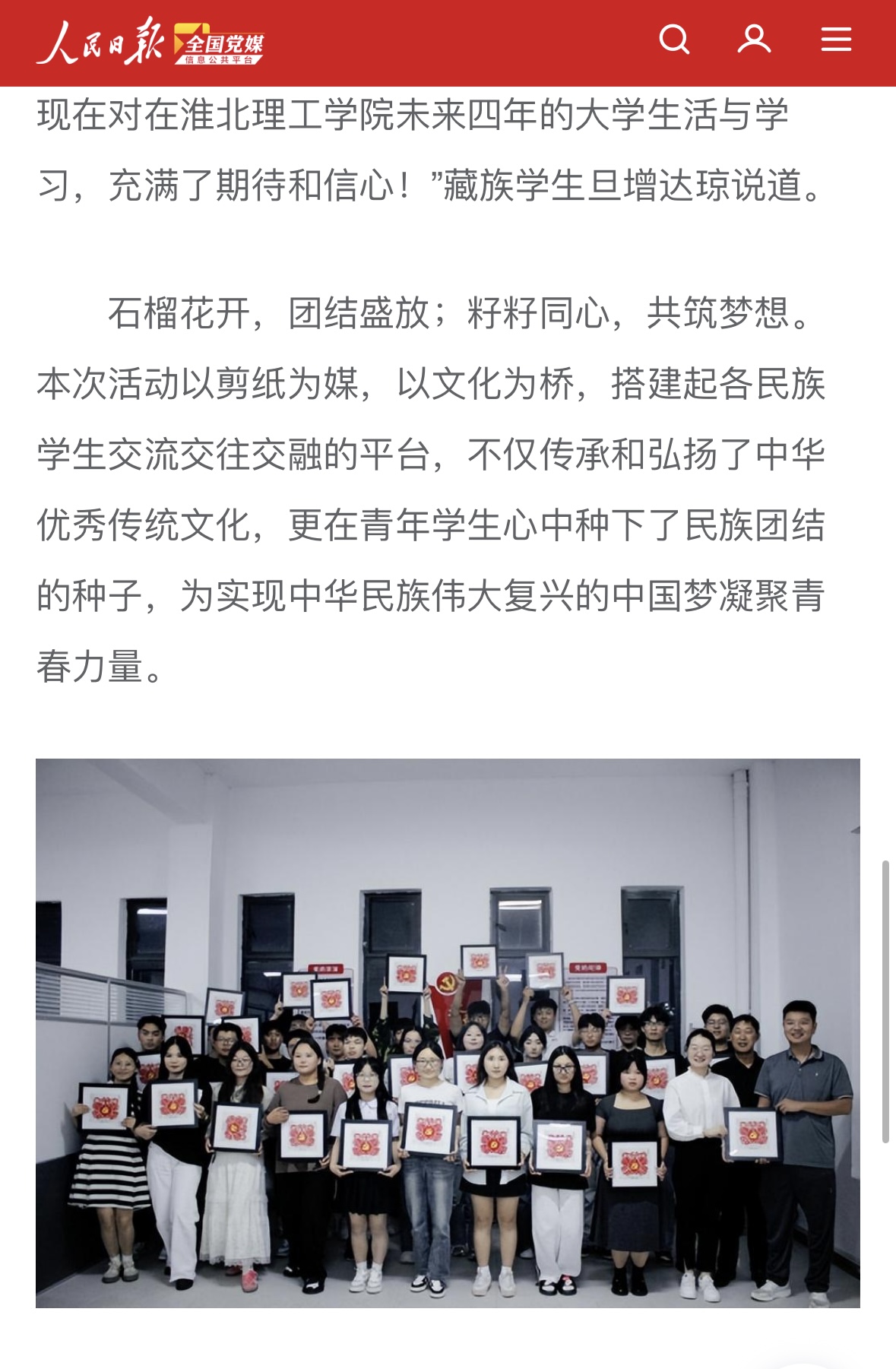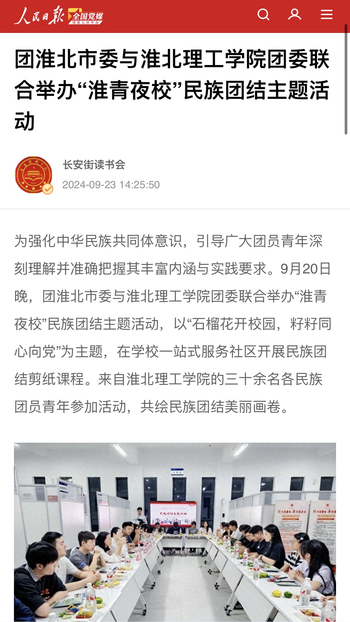 为强化中华民族共同体意识,引导广大团员青年深刻理解并准确把握其丰富内涵与实践要求。9月20日晚,团淮北市委与伟德国际victor1946官网团委联合举办“淮青夜校”民族团结主题活动,以“石榴花开校园,籽籽同心向党”为主题,在学校一站式服务社区开展民族团结剪纸课程。来自伟德国际victor1946官网的三十余名各民族团员青年参加活动,共绘民族团结美丽画卷。对此,人民日报全国党媒信息公共平台进行报道: