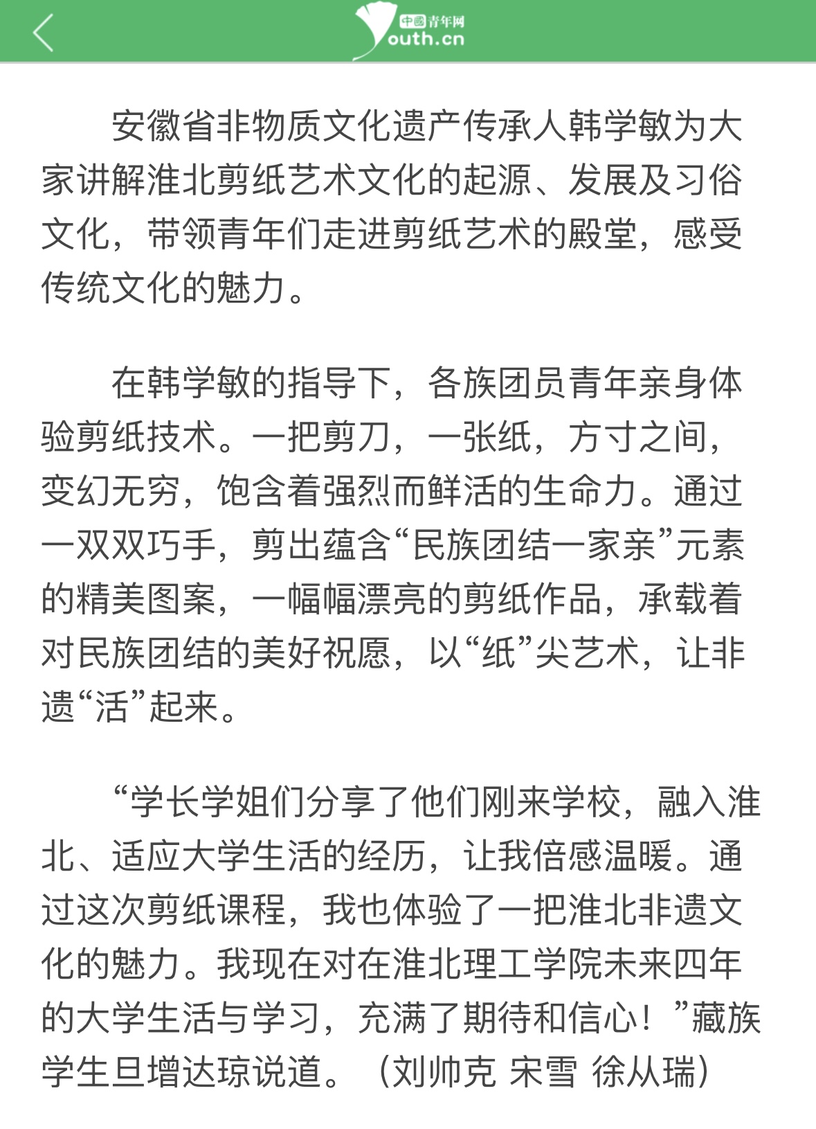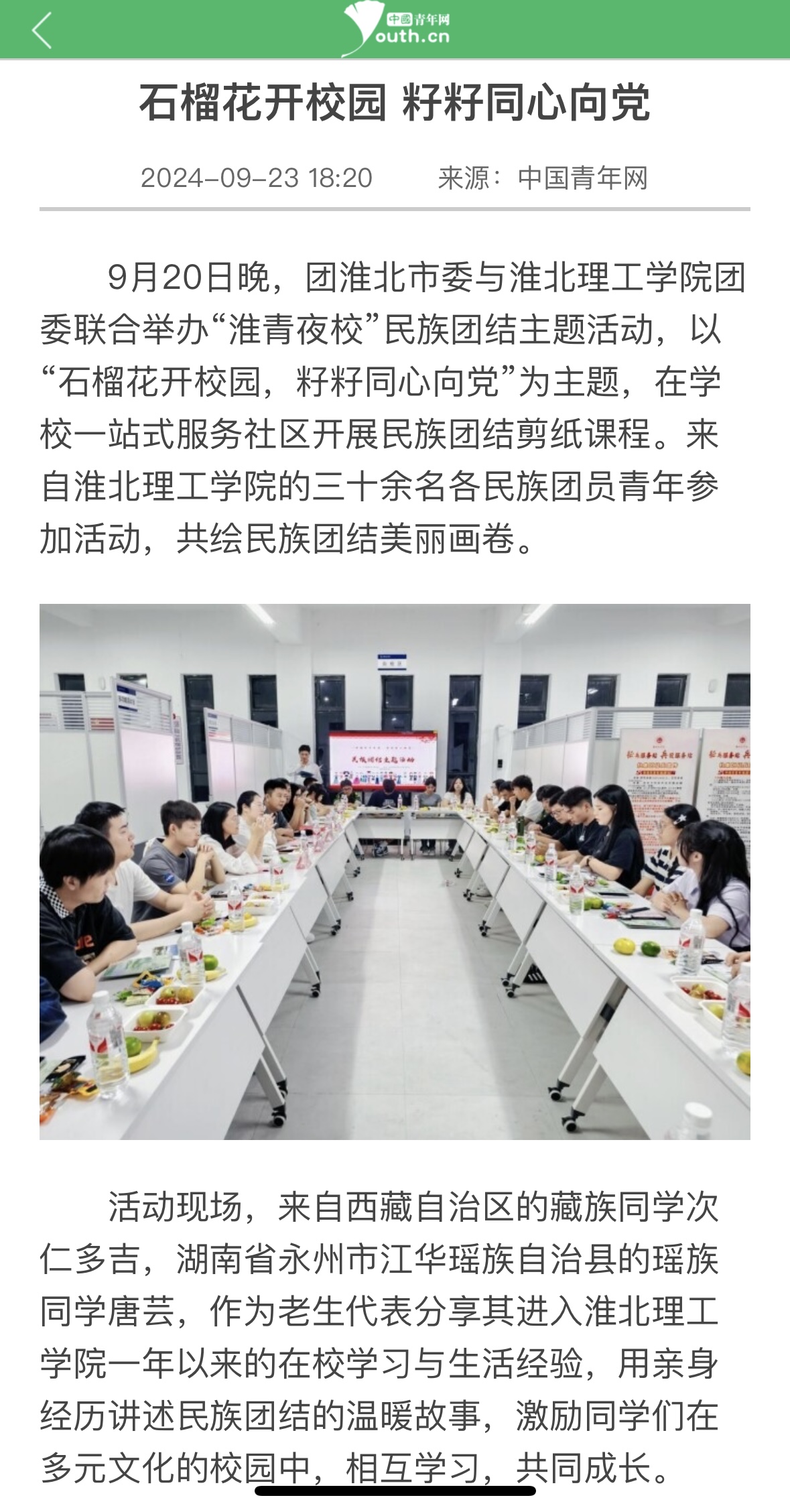 9月20日晚,团淮北市委与伟德国际victor1946官网团委联合举办“淮青夜校”民族团结主题活动,以“石榴花开校园,籽籽同心向党”为主题,在学校一站式服务社区开展民族团结剪纸课程。来自伟德国际victor1946官网的三十余名各民族团员青年参加活动,共绘民族团结美丽画卷。对此,中国青年网进行报道:
