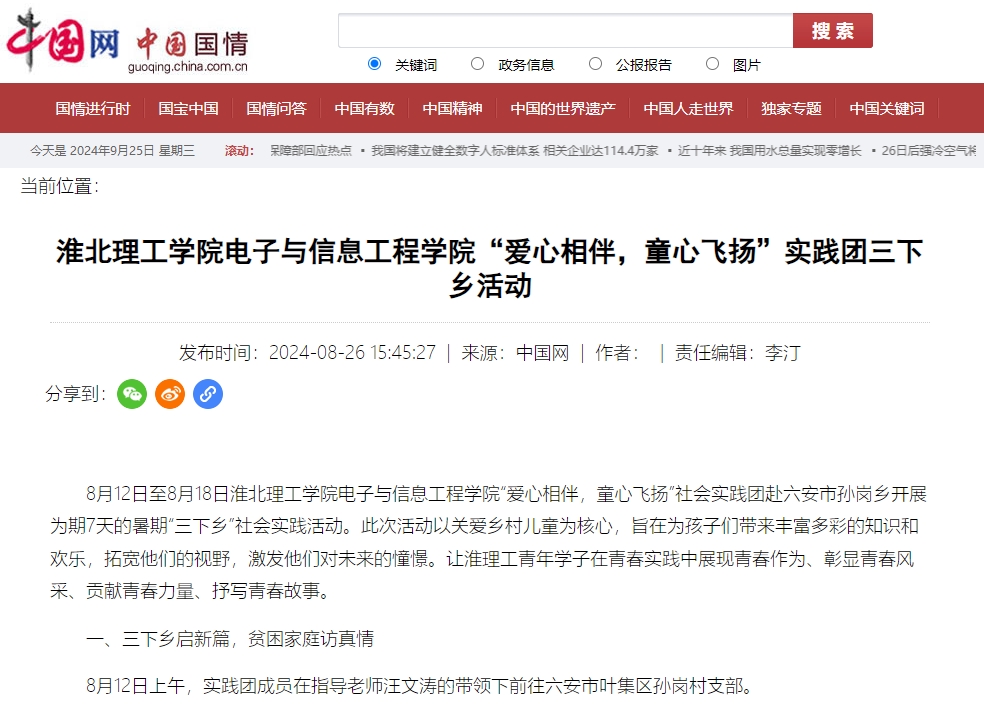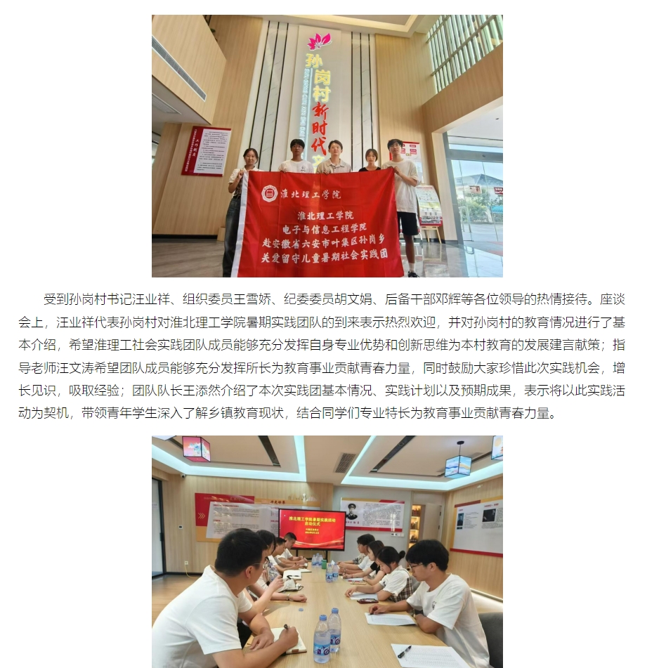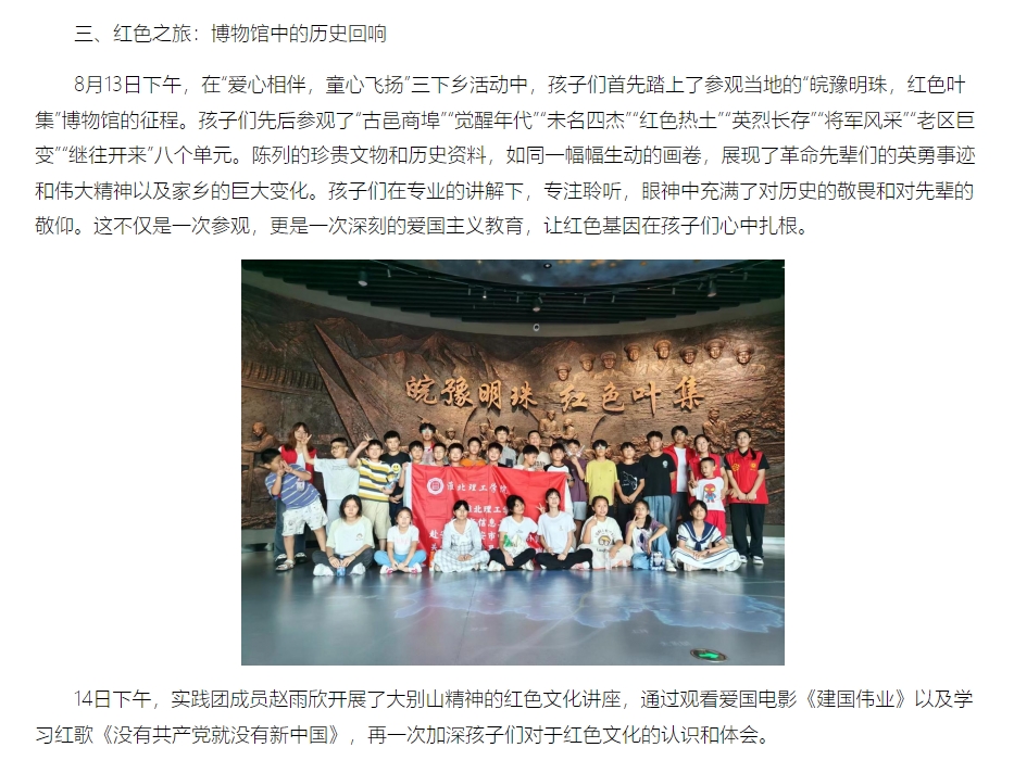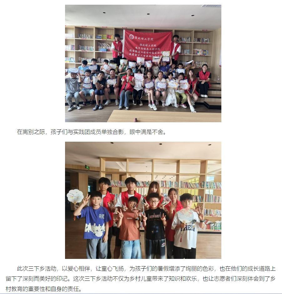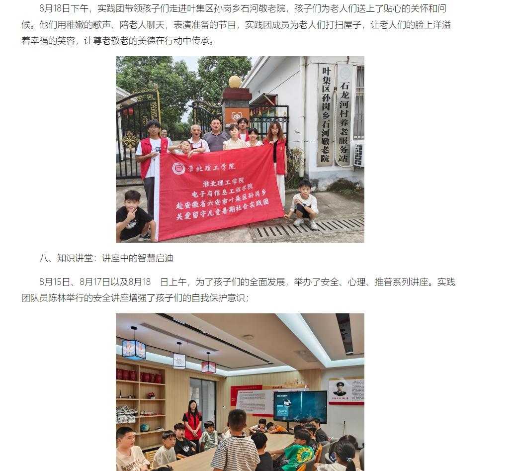 8月12日至8月18日伟德国际victor1946官网电子与信息工程学院“爱心相伴,童心飞扬”社会实践团赴六安市孙岗乡开展为期7天的暑期“三下乡”社会实践活动。此次活动以关爱乡村儿童为核心,旨在为孩子们带来丰富多彩的知识和欢乐,拓宽他们的视野,激发他们对未来的憧憬。让淮理工青年学子在青春实践中展现青春作为、彰显青春风采、贡献青春力量、抒写青春故事。对此,中国网中国国情进行了报道: