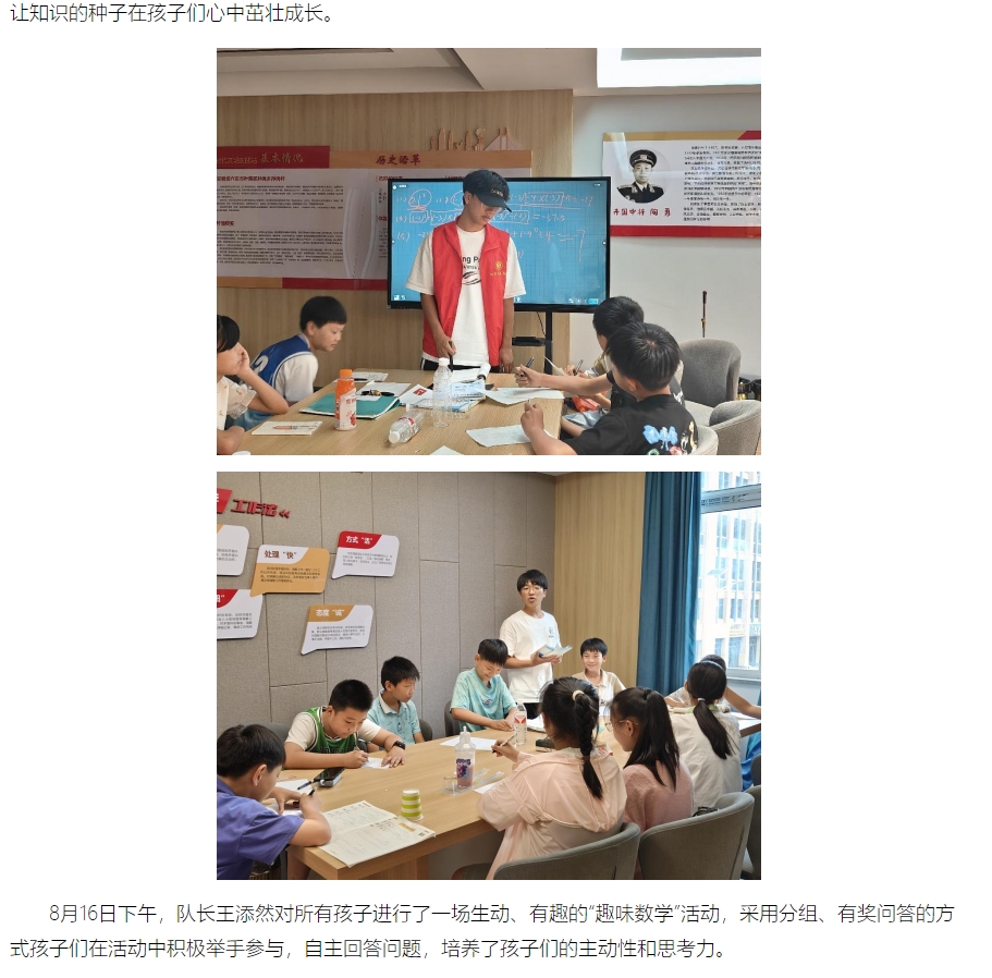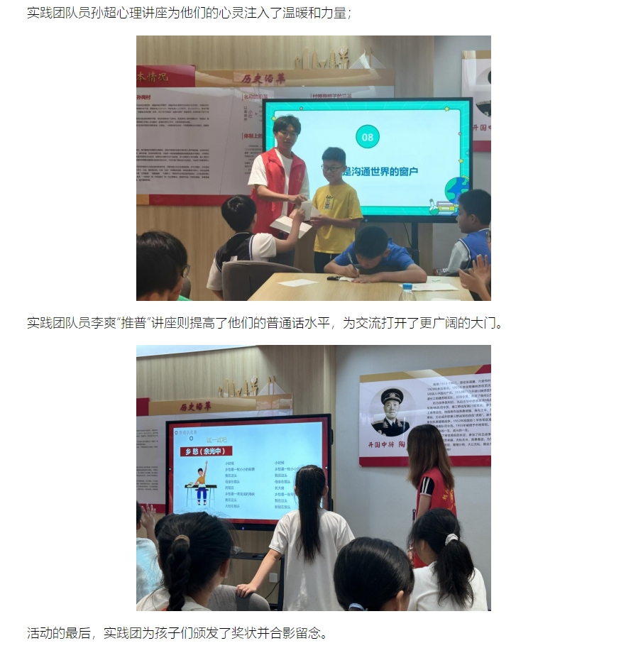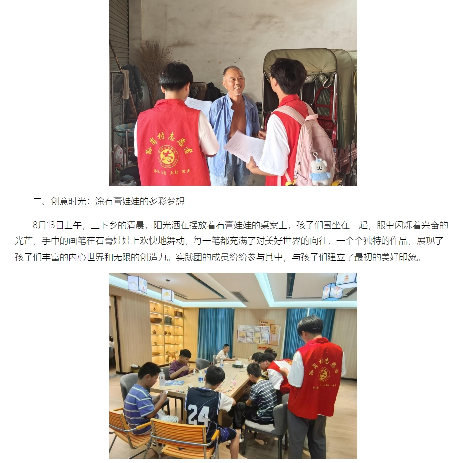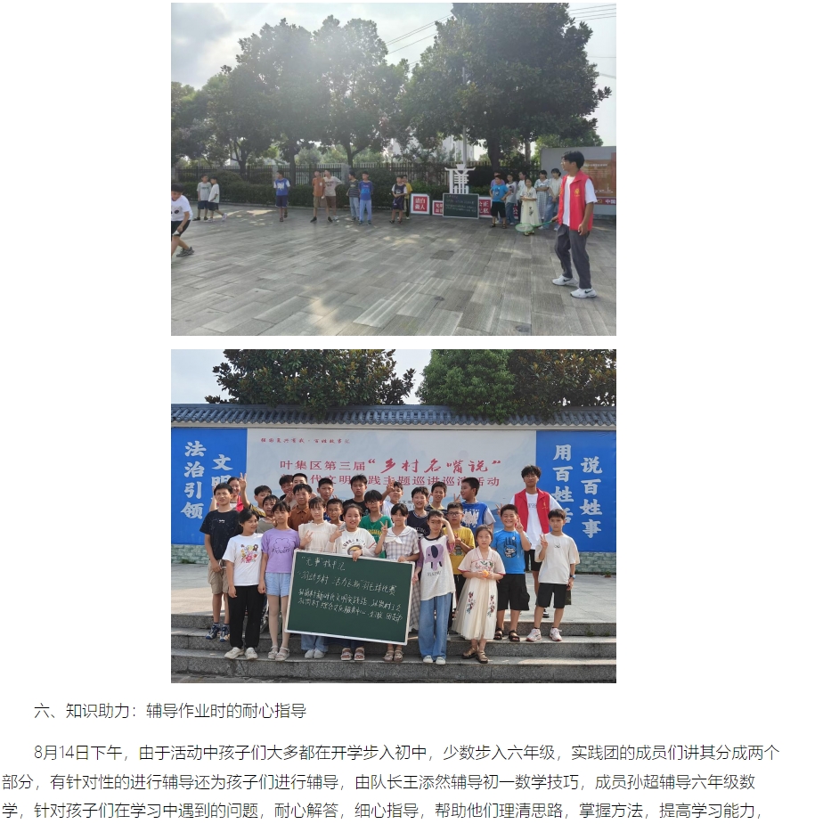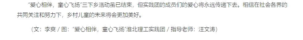 8月12日至8月18日伟德国际victor1946官网电子与信息工程学院“爱心相伴,童心飞扬”社会实践团赴六安市孙岗乡开展为期7天的暑期“三下乡”社会实践活动。此次活动以关爱乡村儿童为核心,旨在为孩子们带来丰富多彩的知识和欢乐,拓宽他们的视野,激发他们对未来的憧憬。让淮理工青年学子在青春实践中展现青春作为、彰显青春风采、贡献青春力量、抒写青春故事。对此,中国网中国国情进行了报道:
