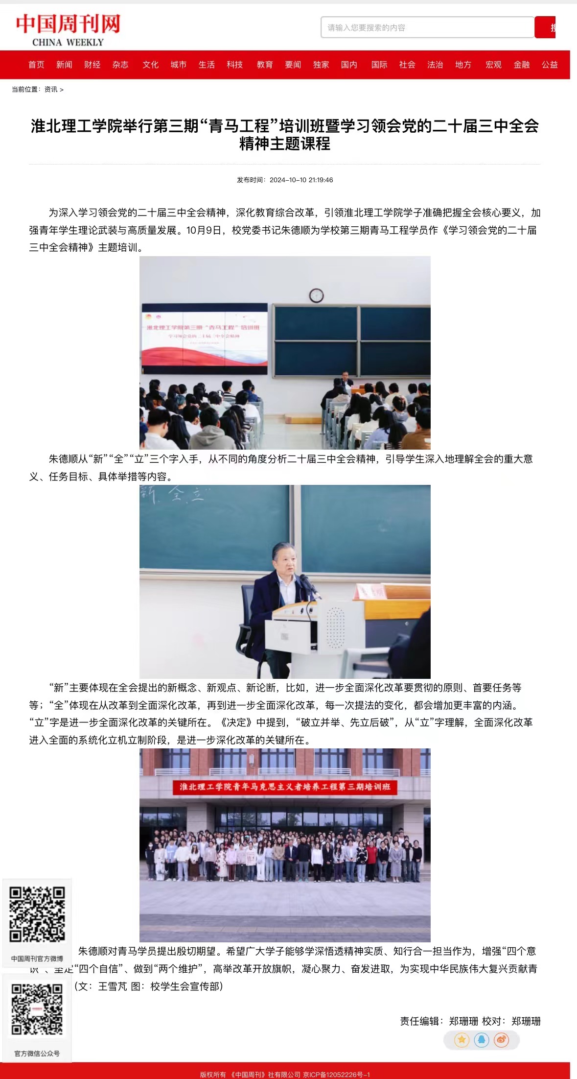 为深入学习领会党的二十届三中全会精神,深化教育综合改革,引领伟德国际victor1946官网学子准确把握全会核心要义,加强青年学生理论武装与高质量发展。10月9日,校党委书记朱德顺为学校第三期青马工程学员作《学习领会党的二十届三中全会精神》主题培训。对此,共青团中央主管媒体——中国周刊网进行了报道: