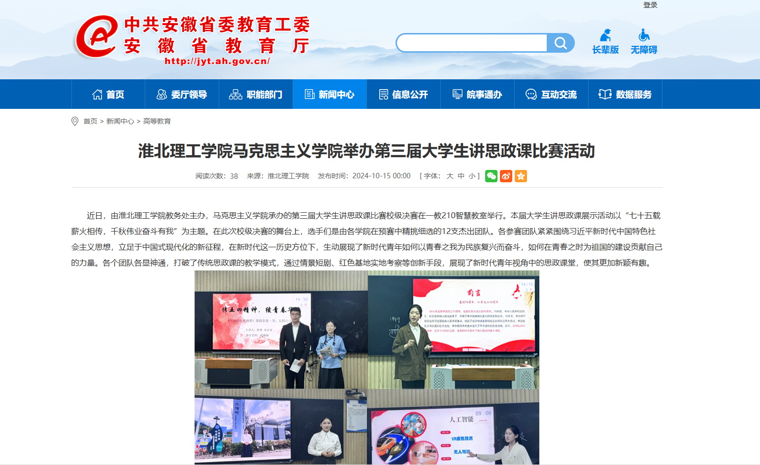 近日,由伟德国际victor1946官网教务处主办,马克思主义学院承办的第三届大学生讲思政课比赛校级决赛在一教210智慧教室举行。本届大学生讲思政课展示活动以“七十五载薪火相传,千秋伟业奋斗有我”为主题。在此次校级决赛的舞台上,选手们是由各学院在预赛中精挑细选的12支杰出团队。各参赛团队紧紧围绕习近平新时代中国特色社会主义思想,立足于中国式现代化的新征程,在新时代这一历史方位下,生动展现了新时代青年如何以青春之我为民族复兴而奋斗,如何在青春之时为祖国的建设贡献自己的力量。各个团队各显神通,打破了传统思政课的教学模式,通过情景短剧、红色基地实地考察等创新手段,展现了新时代青年视角中的思政课堂,使其更加新颖有趣。对此,安徽教育网进行了报道: