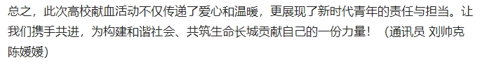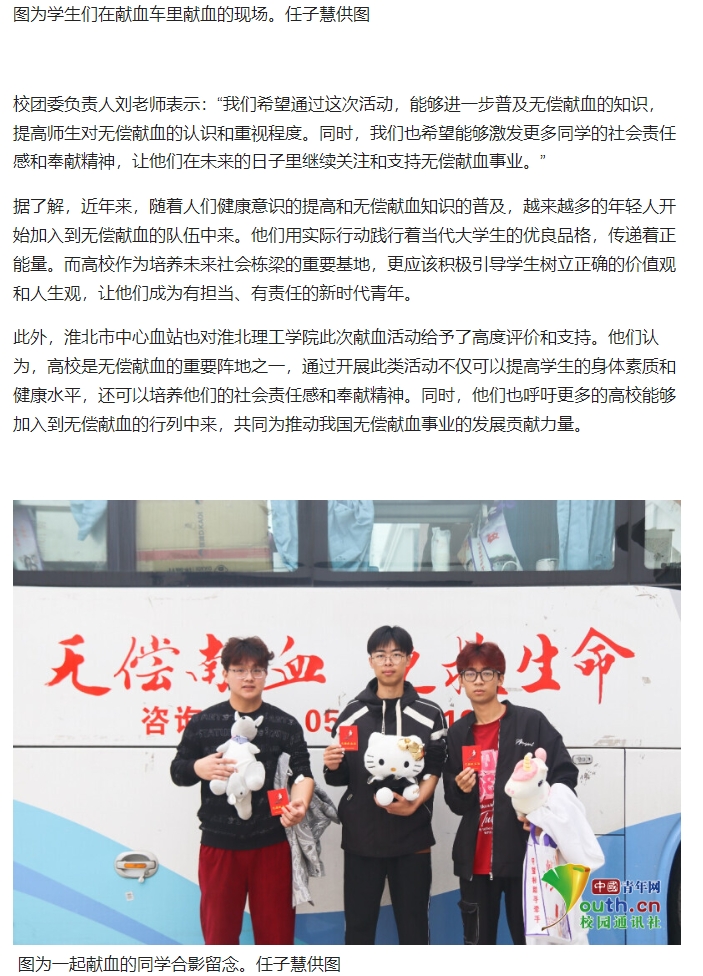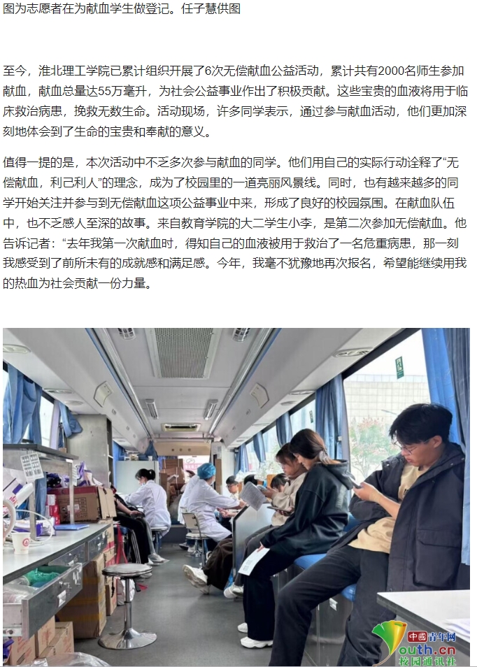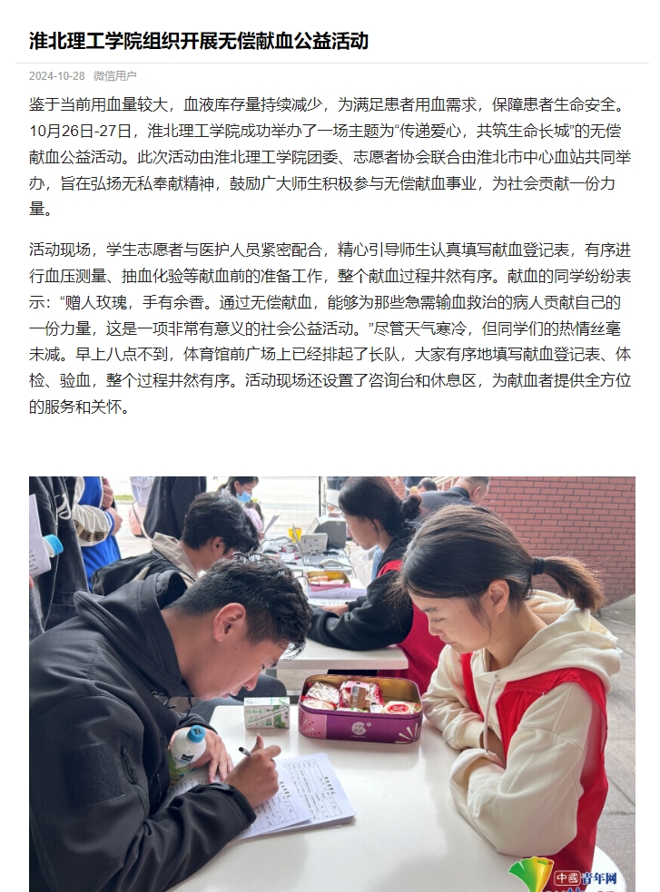 鉴于当前用血量较大,血液库存量持续减少,为满足患者用血需求,保障患者生命安全。10月26日-27日,伟德国际victor1946官网成功举办了一场主题为“传递爱心,共筑生命长城”的无偿献血公益活动。此次活动由伟德国际victor1946官网团委、志愿者协会联合由淮北市中心血站共同举办,旨在弘扬无私奉献精神,鼓励广大师生积极参与无偿献血事业,为社会贡献一份力量。对此,中青校园进行了报道: