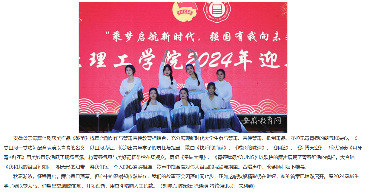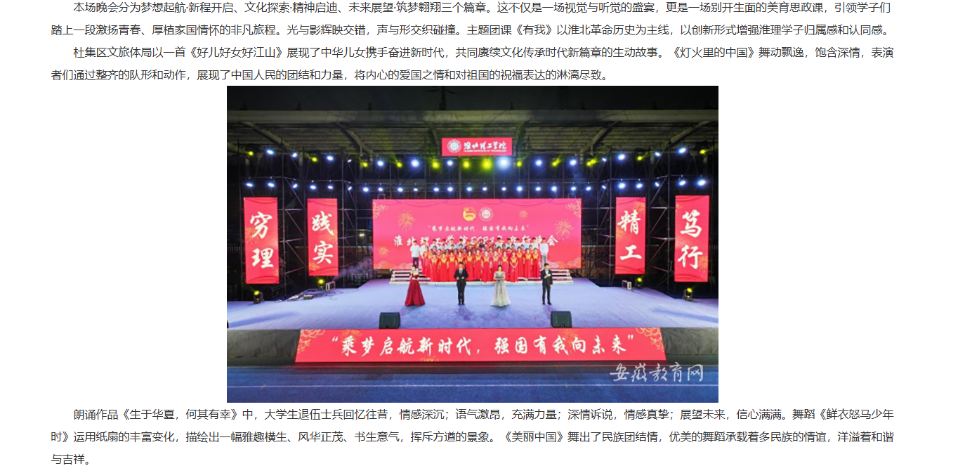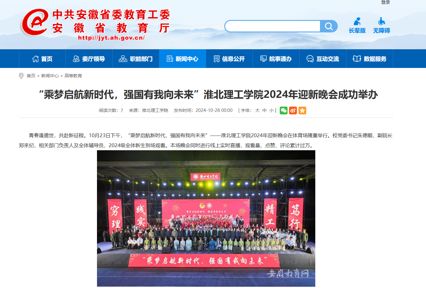 青春逢盛世,共赴新征程。10月23日下午,“乘梦启航新时代,强国有我向未来”——伟德国际victor1946官网2024年迎新晚会在体育场隆重举行。校党委书记朱德顺,副院长郑来纪,相关部门负责人及全体辅导员,2024级全体新生到场观看。本场晚会同时进行线上实时直播,观看量、点赞、评论累计过万。对此,安徽教育网进行了报道: