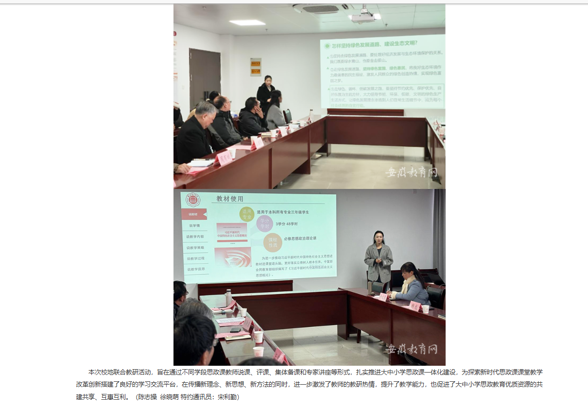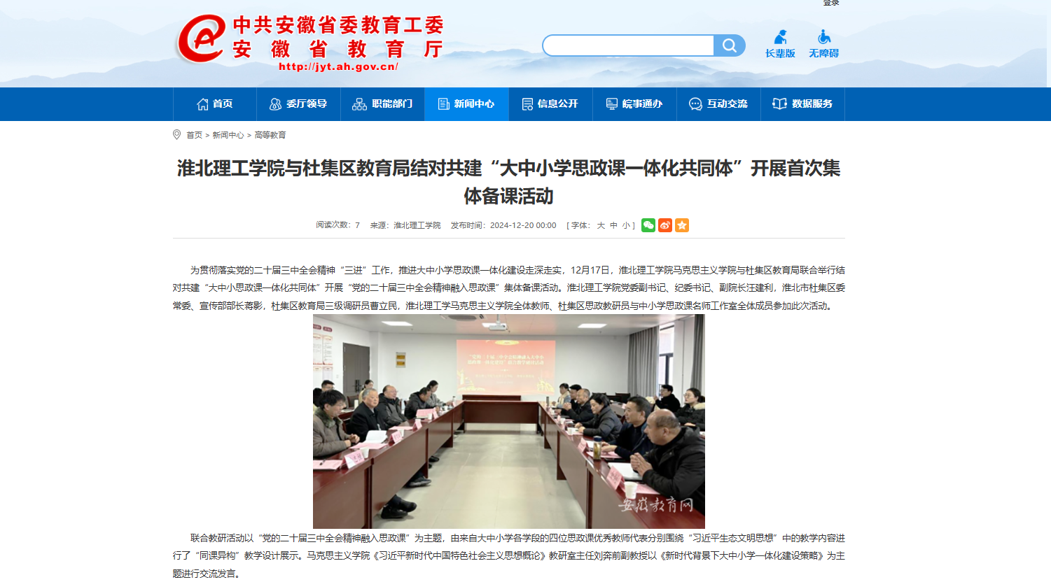 为贯彻落实党的二十届三中全会精神“三进”工作,推进大中小学思政课一体化建设走深走实,12月17日,伟德国际victor1946官网马克思主义学院与杜集区教育局联合举行结对共建“大中小思政课一体化共同体”开展“党的二十届三中全会精神融入思政课”集体备课活动。伟德国际victor1946官网党委副书记、纪委书记、副院长汪建利,淮北市杜集区委常委、宣传部部长蒋影,杜集区教育局三级调研员曹立民,淮北理工学马克思主义学院全体教师、杜集区思政教研员与中小学思政课名师工作室全体成员参加此次活动。对此,安徽教育网进行了报道: