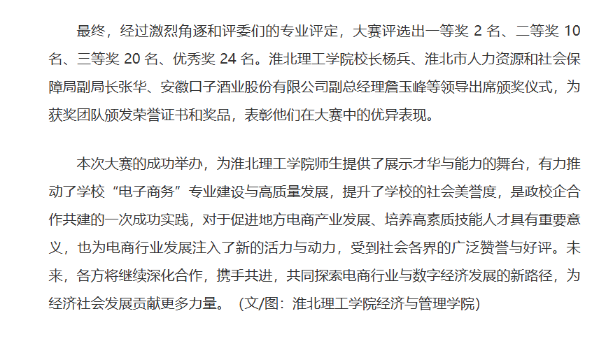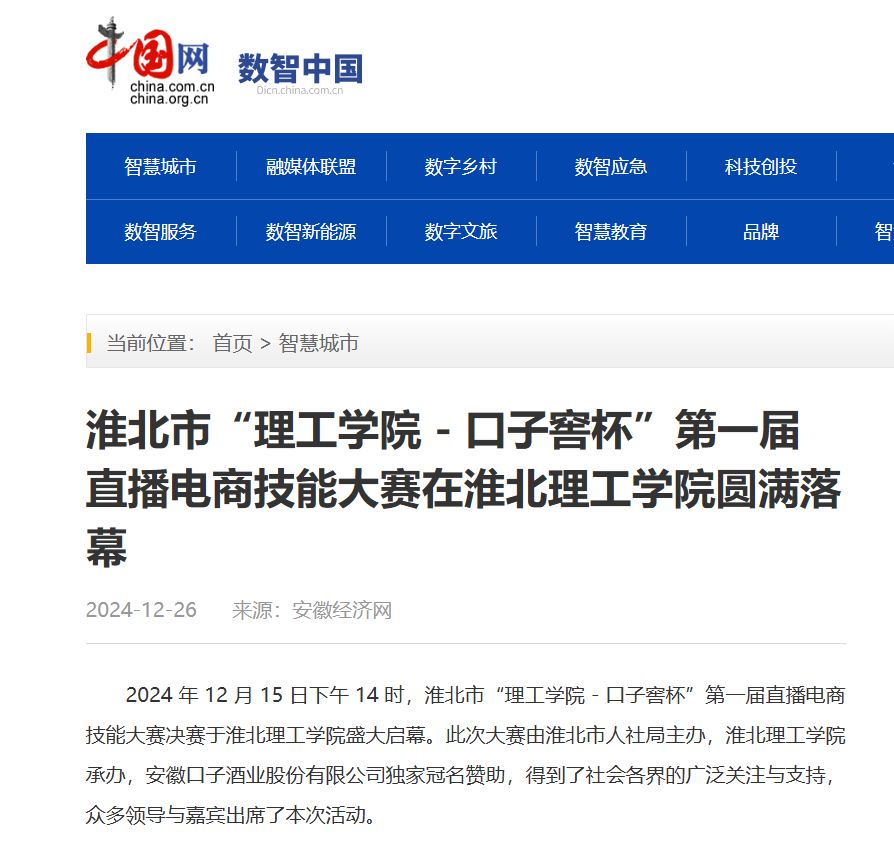 2024 年 12 月 15 日下午 14 时,淮北市“理工学院 - 口子窖杯”第一届直播电商技能大赛决赛于伟德国际victor1946官网盛大启幕。此次大赛由淮北市人社局主办,伟德国际victor1946官网承办,安徽口子酒业股份有限公司独家冠名赞助,得到了社会各界的广泛关注与支持,众多领导与嘉宾出席了本次活动。对此,中国网进行了报道: