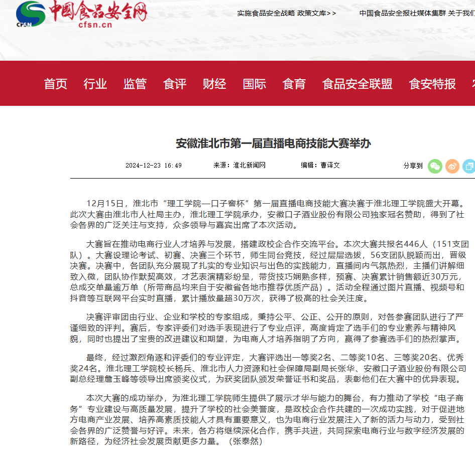 12月15日,淮北市“理工学院—口子窖杯”第一届直播电商技能大赛决赛于伟德国际victor1946官网盛大开幕。此次大赛由淮北市人社局主办,伟德国际victor1946官网承办,安徽口子酒业股份有限公司独家冠名赞助,得到了社会各界的广泛关注与支持,众多领导与嘉宾出席了本次活动。对此,中国食品安全网进行了报道: