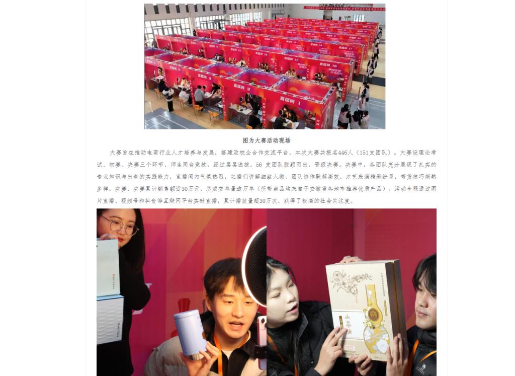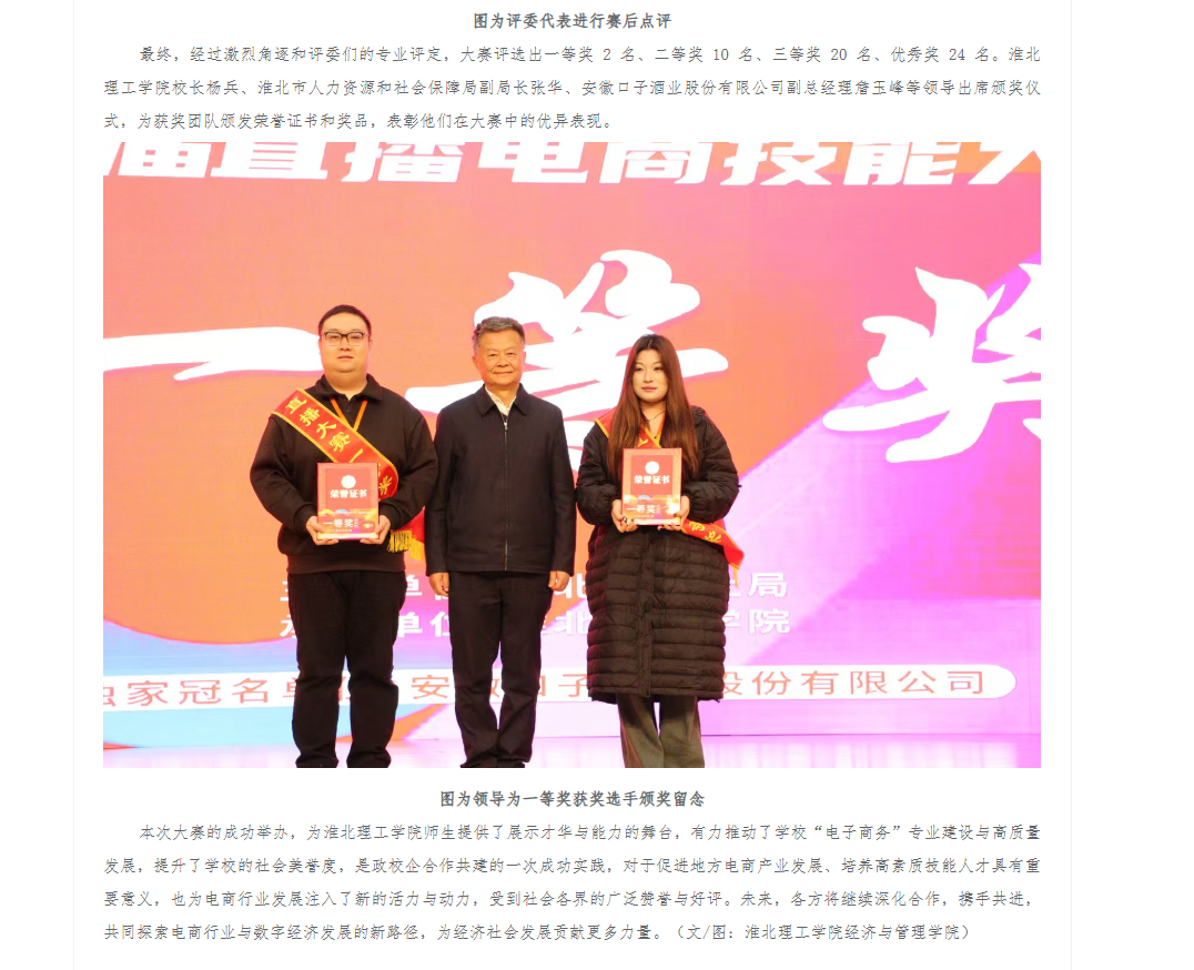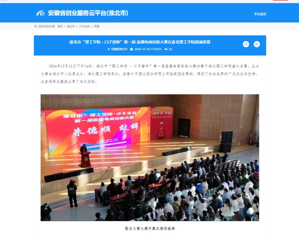 2024年12月15日下午14时,淮北市“理工学院 - 口子窖杯”第一届直播电商技能大赛决赛于伟德国际victor1946官网盛大启幕。此次大赛由淮北市人社局主办,伟德国际victor1946官网承办,安徽口子酒业股份有限公司独家冠名赞助,得到了社会各界的广泛关注与支持,众多领导与嘉宾出席了本次活动。对此,安徽省创业服务云平台进行了报道: