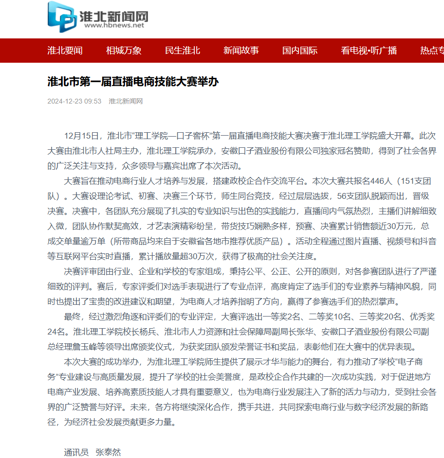 12月15日,淮北市“理工学院—口子窖杯”第一届直播电商技能大赛决赛于伟德国际victor1946官网盛大开幕。此次大赛由淮北市人社局主办,伟德国际victor1946官网承办,安徽口子酒业股份有限公司独家冠名赞助,得到了社会各界的广泛关注与支持,众多领导与嘉宾出席了本次活动。对此,淮北新闻网进行了报道: