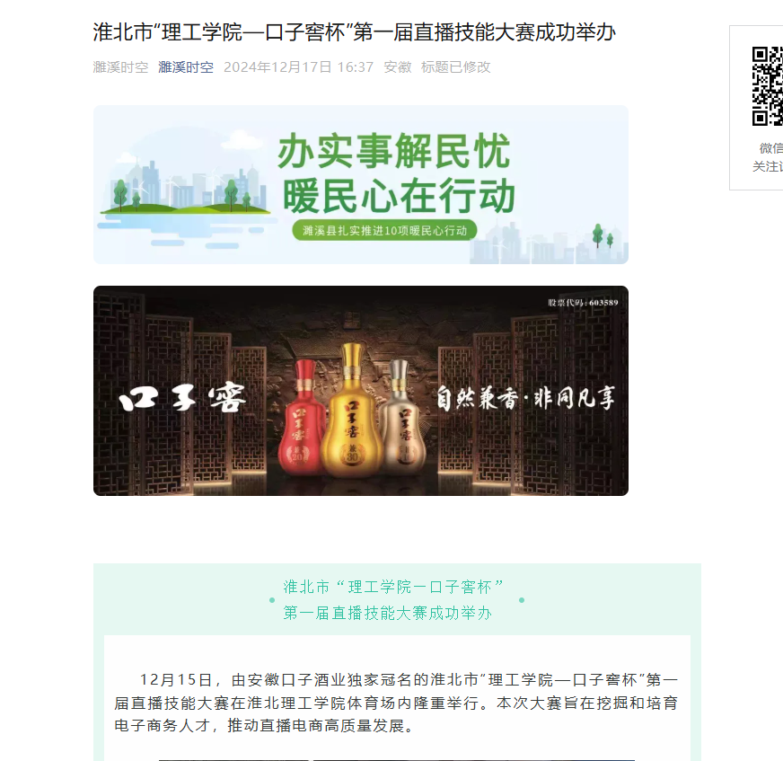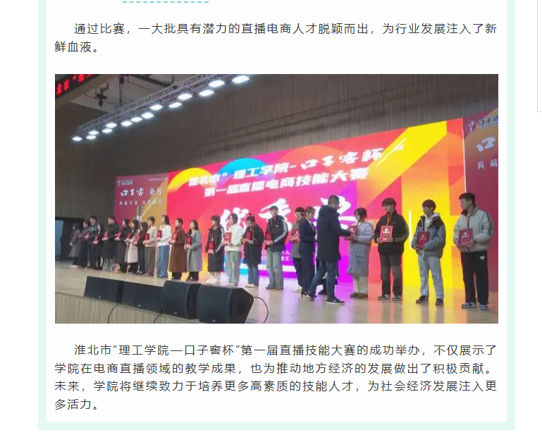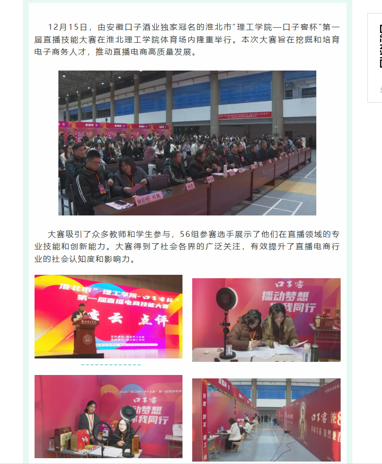 12月15日,由安徽口子酒业独家冠名的淮北市“理工学院—口子窖杯”第一届直播技能大赛在伟德国际victor1946官网体育场内隆重举行。本次大赛旨在挖掘和培育电子商务人才,推动直播电商高质量发展。对此,濉溪时空进行了报道: