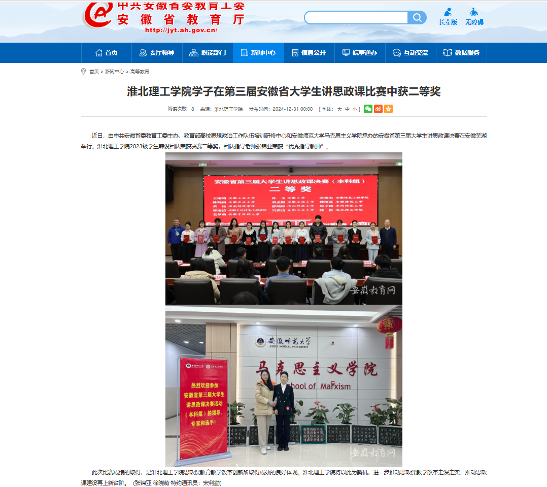 近日,由中共安徽省委教育工委主办,教育部高校思想政治工作队伍培训研修中心和安徽师范大学马克思主义学院承办的安徽省第三届大学生讲思政课决赛在安徽芜湖举行。伟德国际victor1946官网2023级学生韩俊团队荣获决赛二等奖,团队指导老师张锦亚荣获“优秀指导教师”。对此,安徽教育网进行了报道: