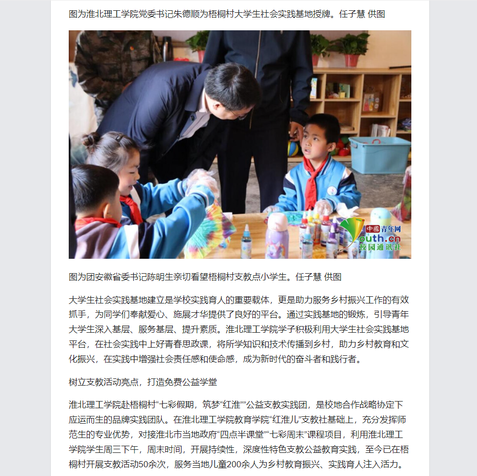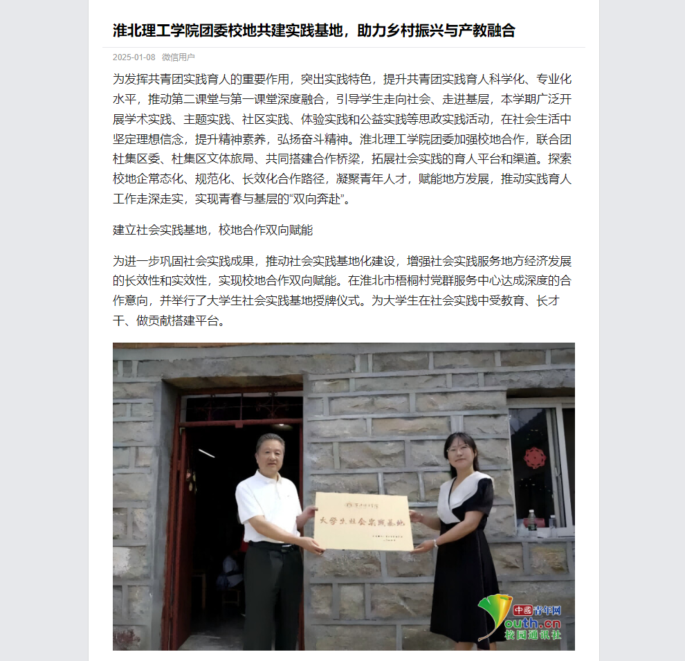 为发挥共青团实践育人的重要作用,突出实践特色,提升共青团实践育人科学化、专业化水平,推动第二课堂与第一课堂深度融合,引导学生走向社会、走进基层,本学期广泛开展学术实践、主题实践、社区实践、体验实践和公益实践等思政实践活动,在社会生活中坚定理想信念,提升精神素养,弘扬奋斗精神。伟德国际victor1946官网团委加强校地合作,联合团杜集区委、杜集区文体旅局、共同搭建合作桥梁,拓展社会实践的育人平台和渠道。探索校地企常态化、规范化、长效化合作路径,凝聚青年人才,赋能地方发展,推动实践育人工作走深走实,实现青春与基层的“双向奔赴”。对此,中国青年网进行了报道: