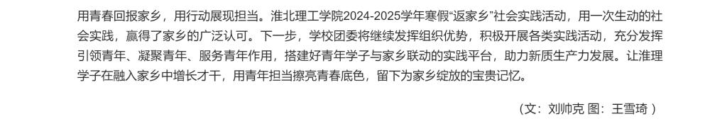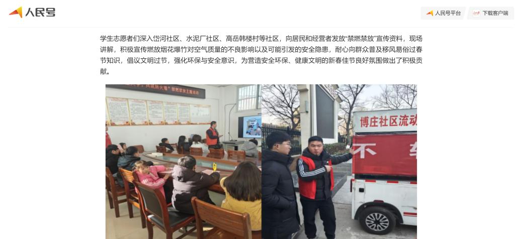为深入学习宣传贯彻关于青年工作的重要思想,推动团员和青年主题教育走深走实,2024-2025学年寒假期间,伟德国际victor1946官网团委广泛组织动员团员青年深入开展寒假社会实践活动,深入各镇乡(街道)、村(社区)开展志愿服务大学生“返家乡”当地社会实践等一系列丰富多彩的志愿服务活动,旨在培养大学生的社会责任感和实践能力,同时为社会贡献青春力量。对此,人民日报人民号进行了报道: