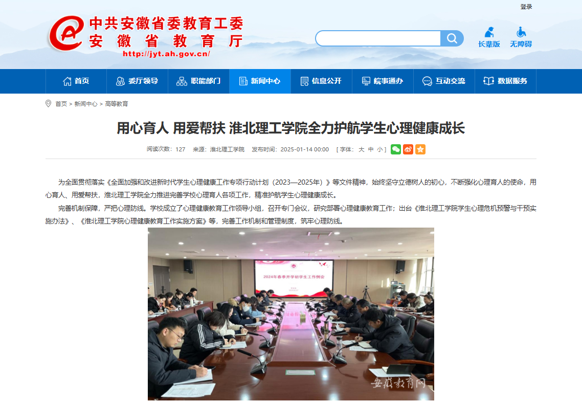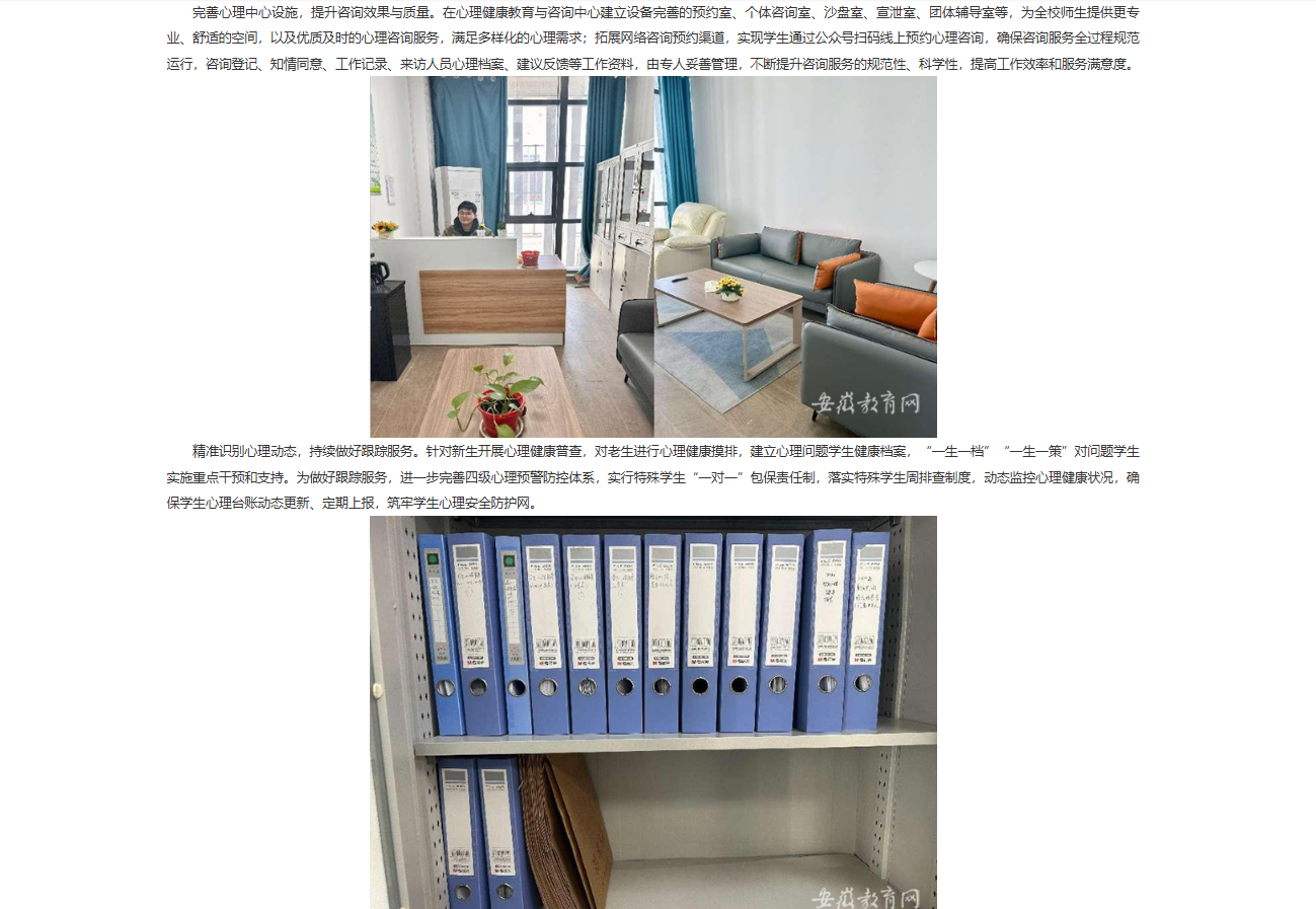 为全面贯彻落实《全面加强和改进新时代学生心理健康工作专项行动计划(2023—2025年)》等文件精神,始终坚守立德树人的初心,不断强化心理育人的使命,用心育人、用爱帮扶,伟德国际victor1946官网全力推进完善学校心理育人各项工作,精准护航学生心理健康成长。对此,安徽教育网进行了报道: