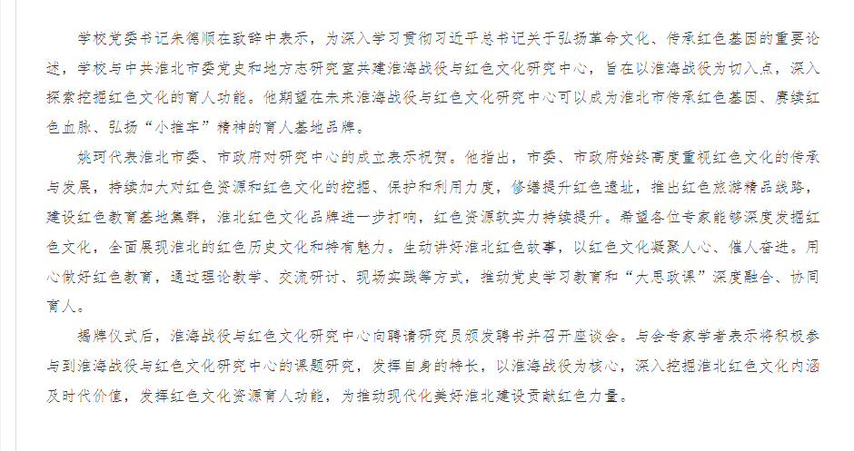 12月24日下午,中共淮北市委党史和地方志研究室与伟德国际victor1946官网共建“淮海战役与红色文化研究中心”举行揭牌仪式。淮北市委副书记孙艳辉、副市长姚珂、市委副秘书长谢谢、市政府副秘书长王江等市委市政府领导,市委党史和地方志研究室主任张红,伟德国际victor1946官网校领导及相关部门和二级学院主要负责人,萧县蔡洼、永城市陈官庄,濉溪县临涣文昌宫、小李家、双堆集等淮海战役纪念馆负责人,“淮海战役与红色文化研究中心”聘请研究员及学校师生代表共同出席揭牌仪式,伟德国际victor1946官网校长杨兵主持。对此,淮北党史和地方志网进行了报道: