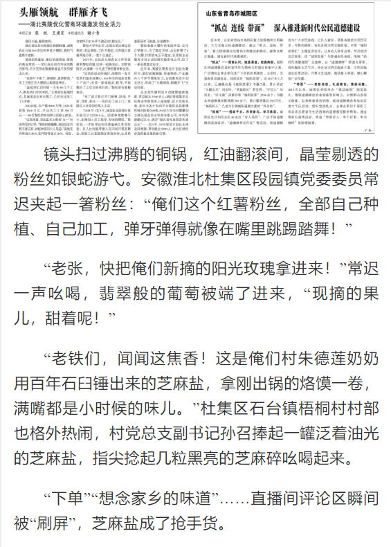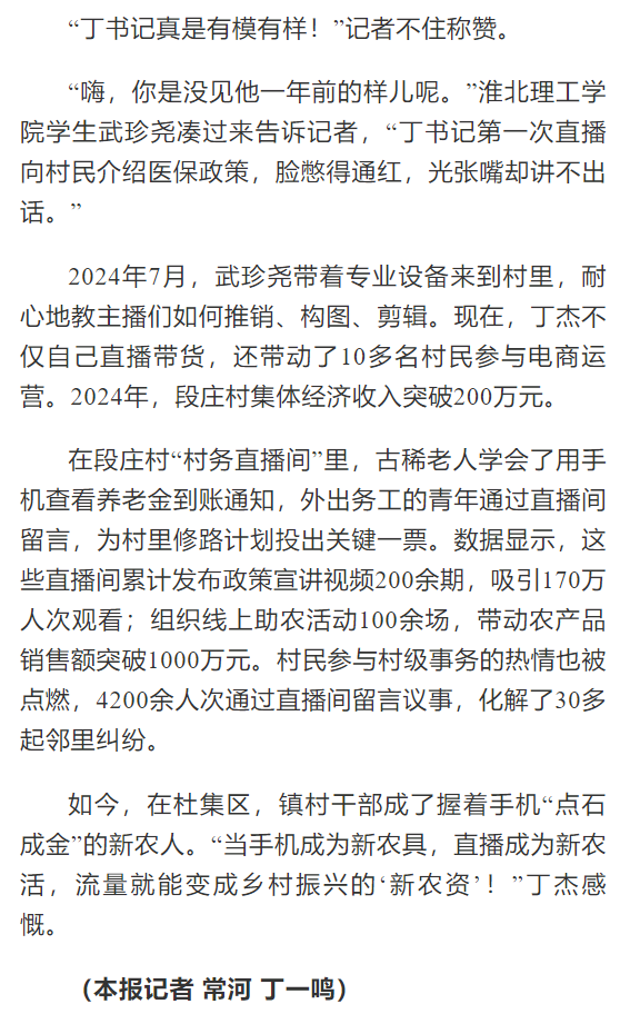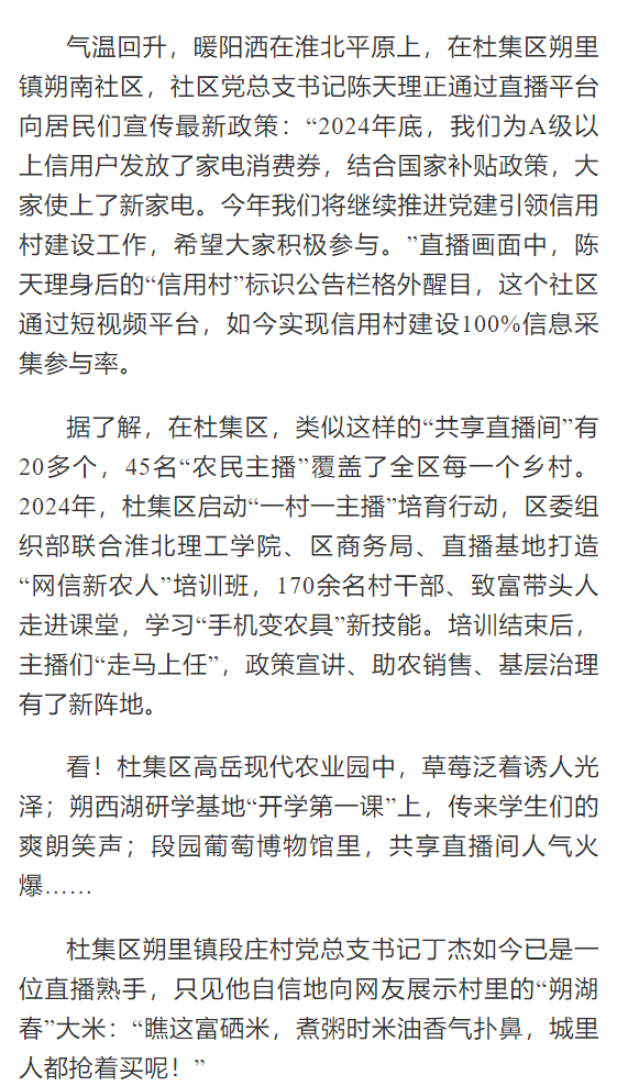 2024年,杜集区启动“一村一主播”培育行动,区委组织部联合伟德国际victor1946官网、区商务局、直播基地打造“网信新农人”培训班,170余名村干部、致富带头人走进课堂,学习“手机变农具”新技能。2024年7月,伟德国际victor1946官网的武珍尧带着专业设备来到杜集区朔里镇段庄村,耐心地教主播们如何推销、构图、剪辑。现在,杜集区朔里镇段庄村党总支书记丁杰如今已是一位直播熟手,他不仅自己直播带货,还带动了10多名村民参与电商运营,2024年,段庄村集体经济收入突破200万元。对此,光明日报进行了报道: