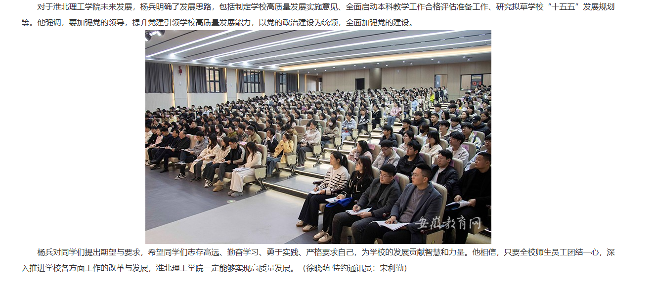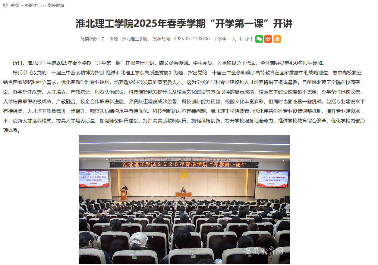 近日,伟德国际victor1946官网2025年春季学期“开学第一课”在报告厅开讲,院长杨兵授课。学生党员、入党积极分子代表,全体辅导员等450名师生参加。对此,安徽教育网进行了报道: