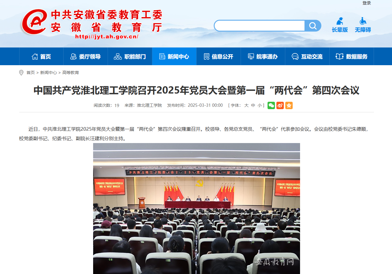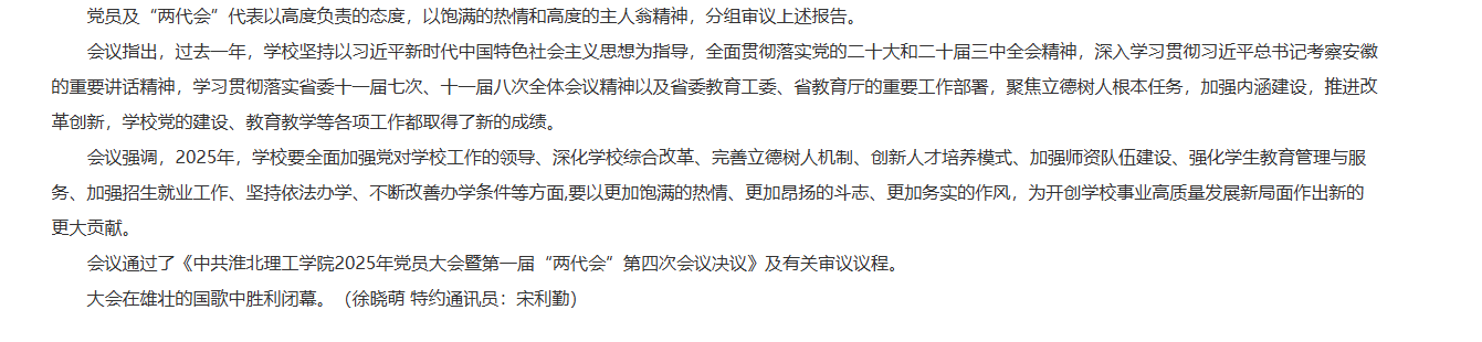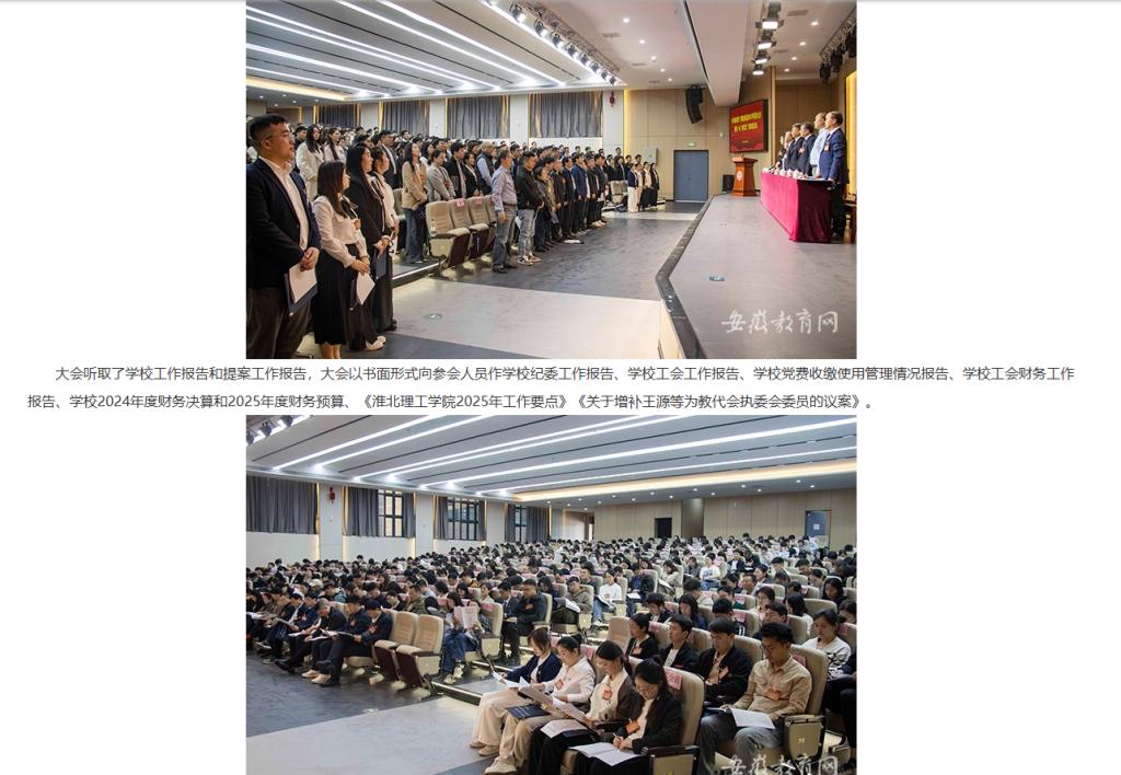 近日,中共伟德国际victor1946官网2025年党员大会暨第一届“两代会”第四次会议隆重召开。校领导、各党总支党员、“两代会”代表参加会议。会议由校党委书记朱德顺,校党委副书记、纪委书记、副院长汪建利分别主持。对此,安徽教育网进行了报道: