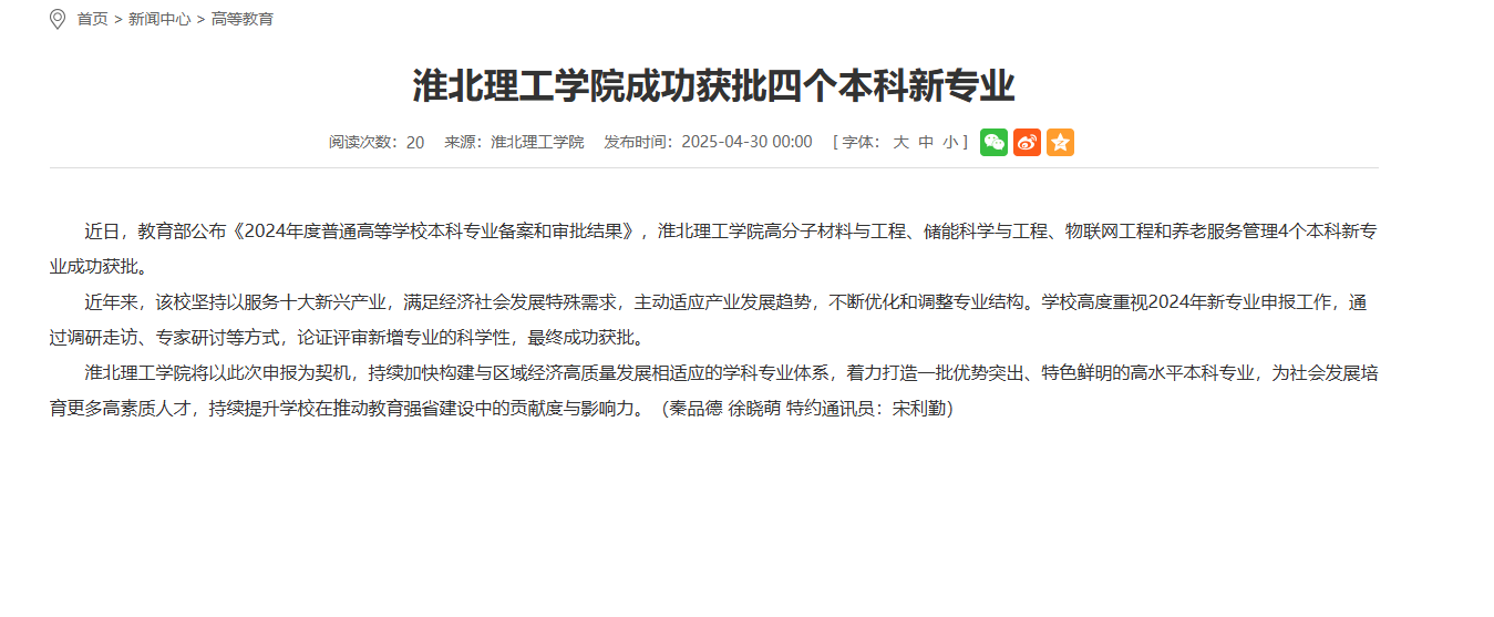 近日,教育部公布《2024年度普通高等学校本科专业备案和审批结果》,伟德国际victor1946官网高分子材料与工程、储能科学与工程、物联网工程和养老服务管理4个本科新专业成功获批。对此,安徽教育网进行了报道: