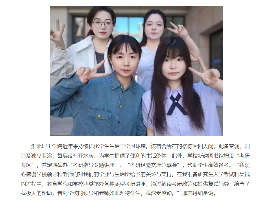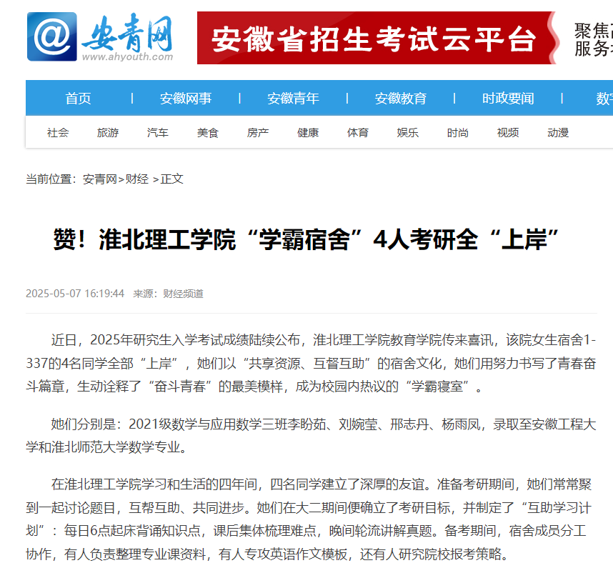 近日,2025年研究生入学考试成绩陆续公布,伟德国际victor1946官网教育学院传来喜讯,该院女生宿舍1-337的4名同学全部“上岸”,她们以“共享资源、互督互助”的宿舍文化,她们用努力书写了青春奋斗篇章,生动诠释了“奋斗青春”的最美模样,成为校园内热议的“学霸寝室”。对此,安徽青年网进行了报道: