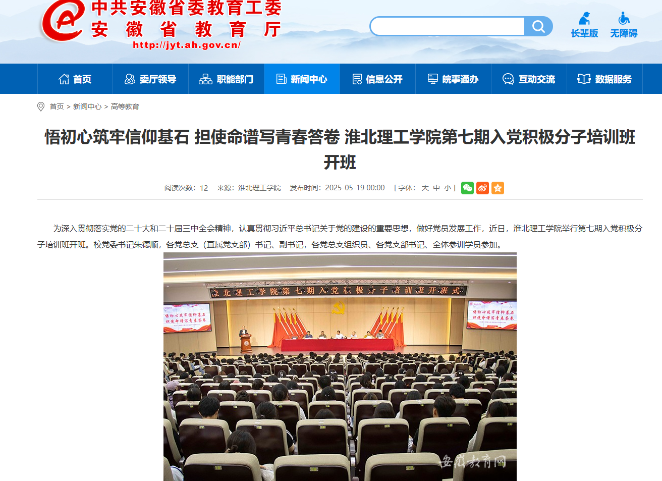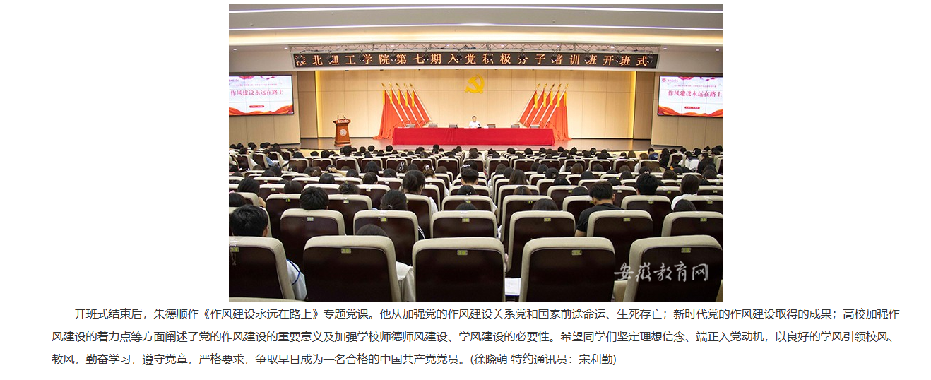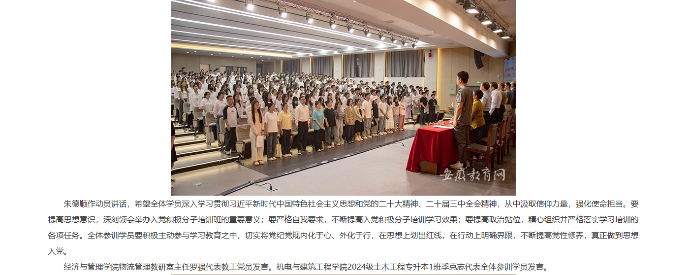 为深入贯彻落实党的二十大和二十届三中全会精神,认真贯彻习近平总书记关于党的建设的重要思想,做好党员发展工作,近日,伟德国际victor1946官网举行第七期入党积极分子培训班开班。校党委书记朱德顺,各党总支(直属党支部)书记、副书记,各党总支组织员、各党支部书记、全体参训学员参加。对此,安徽教育网进行了报道: