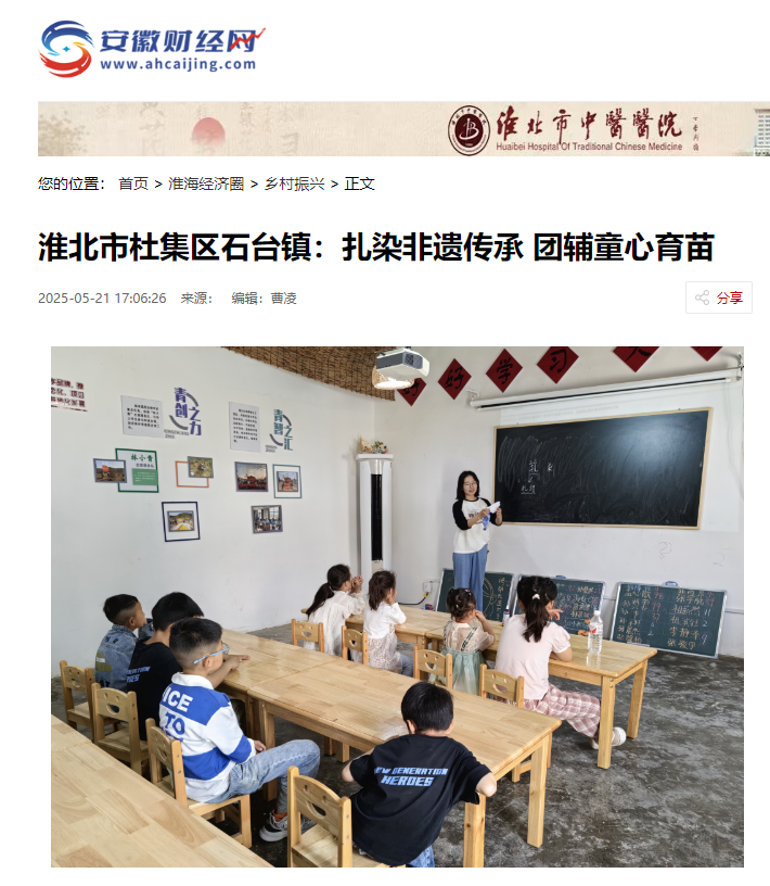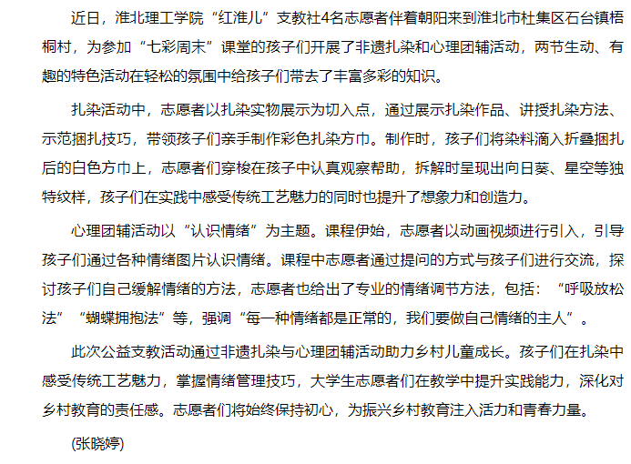 近日,伟德国际victor1946官网“红淮儿”支教社4名志愿者伴着朝阳来到淮北市杜集区石台镇梧桐村,为参加“七彩周末”课堂的孩子们开展了非遗扎染和心理团辅活动,两节生动、有趣的特色活动在轻松的氛围中给孩子们带去了丰富多彩的知识。对此,安徽财经网进行了报道: