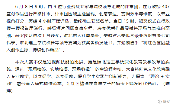 自 4 月 11 日启动,历经理论考试、初赛选拔等环节,6 月 8 日下午,由淮北市人社局主办、伟德国际victor1946官网承办、安徽省六安瓜片茶业股份有限公司(徽六)赞助的淮北市“理工学院 — 徽六杯” 第一届短视频技能大赛决赛在伟德国际victor1946官网圆满收官。这场吸引 215 支队伍、625 名师生同场竞技的赛事,以 “红色传承,青春映像” 为主题,让淮北青年用镜头诠释红色文化,为红色精神传播注入青春力量。对此,今日头条进行了报道: