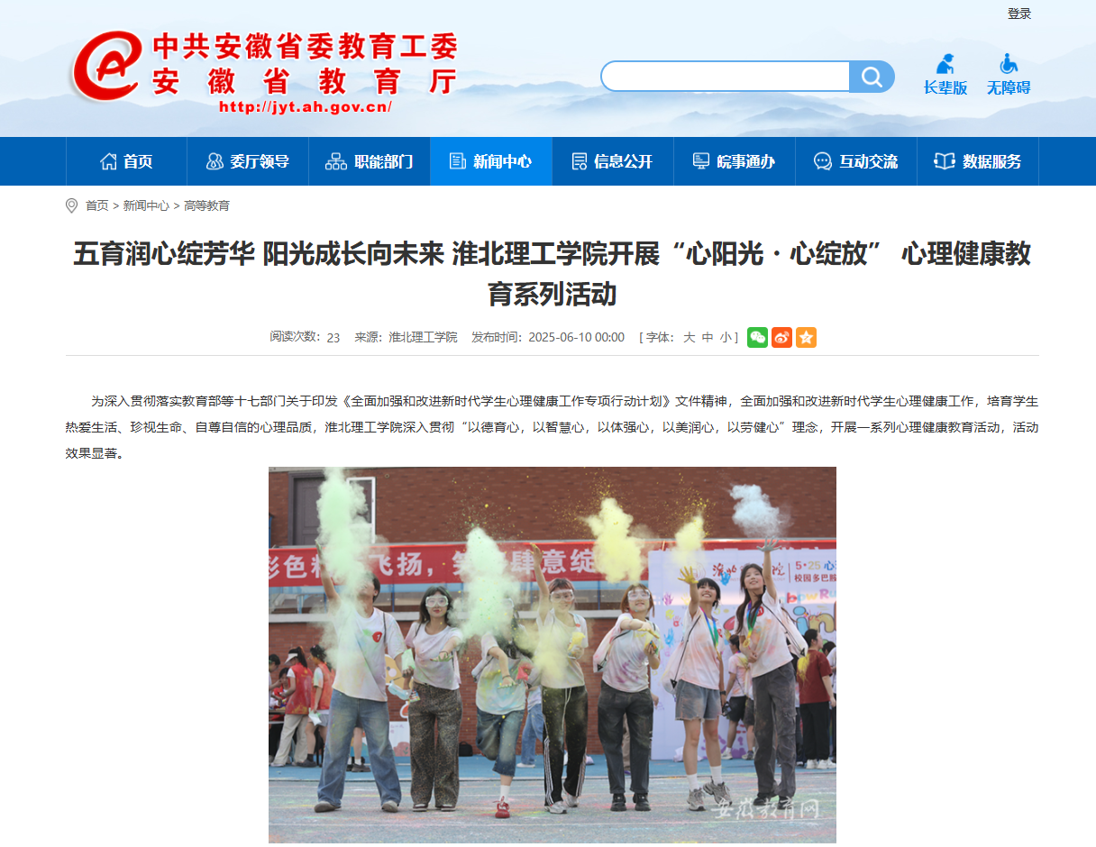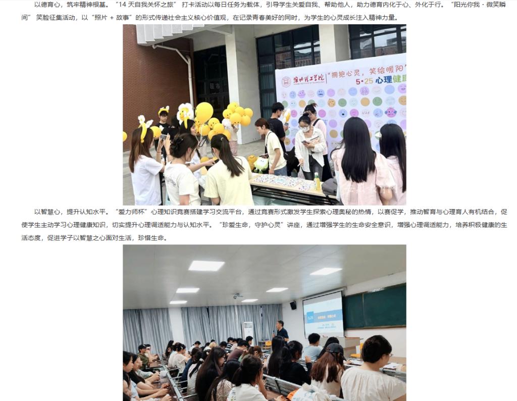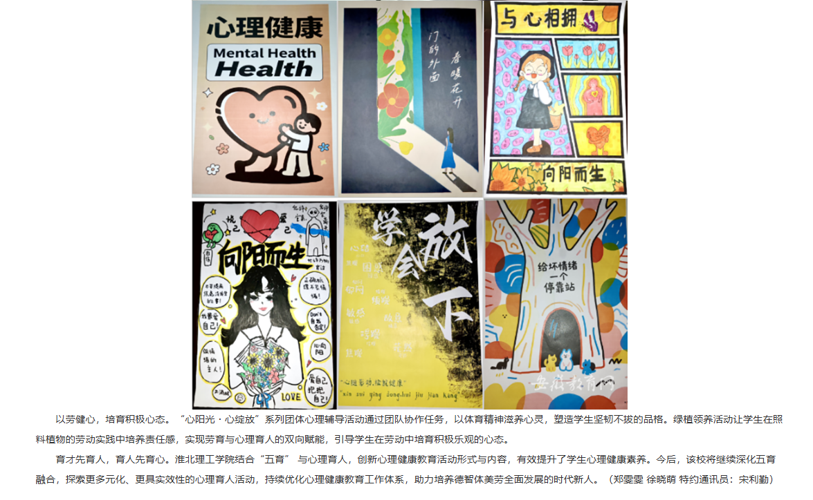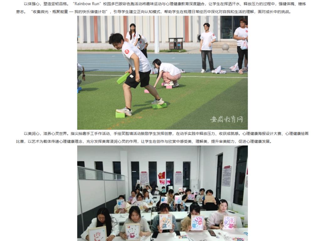 为深入贯彻落实教育部等十七部门关于印发《全面加强和改进新时代学生心理健康工作专项行动计划》文件精神,全面加强和改进新时代学生心理健康工作,培育学生热爱生活、珍视生命、自尊自信的心理品质,伟德国际victor1946官网深入贯彻“以德育心,以智慧心,以体强心,以美润心,以劳健心”理念,开展一系列心理健康教育活动,活动效果显著。对此,安徽教育网进行了报道: