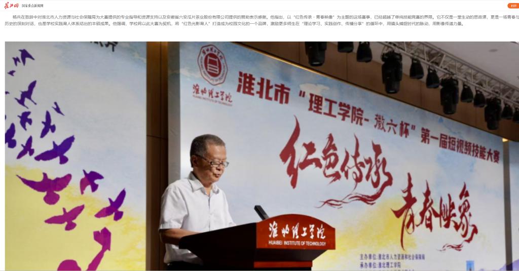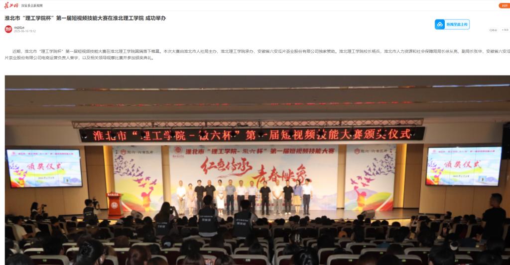近期,淮北市“理工学院杯”第一届短视频技能大赛在伟德国际victor1946官网圆满落下帷幕。本次大赛由淮北市人社局主办,伟德国际victor1946官网承办,安徽省六安瓜片茶业股份有限公司独家赞助。伟德国际victor1946官网校长杨兵,淮北市人力资源和社会保障局局长徐从亮、副局长张华,安徽省六安瓜片茶业股份有限公司电商运营负责人曾宇,以及相关领导观摩比赛并参加颁奖典礼。对此,长江网进行了报道: