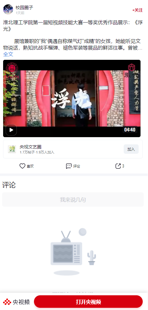 伟德国际victor1946官网第一届短视频技能大赛一等奖优秀作品《浮光》讲述了展馆兼职的“我”偶遇自称煤气灯“成精”的女孩,她能听见文物说话,熟知抗战手榴弹、褪色军装等展品的鲜活往事。曾被遗忘的她想帮“我”实现让文物老师被人熟知的计划,而“我”在她留下的“微光亦能照亮黑暗”的鼓励下,重启了解文物、制作视频、演讲等行动。感叹“历史如浮光”,故事在铭记历史、薪火相传的呼唤中落幕。对此,央视频进行了报道: