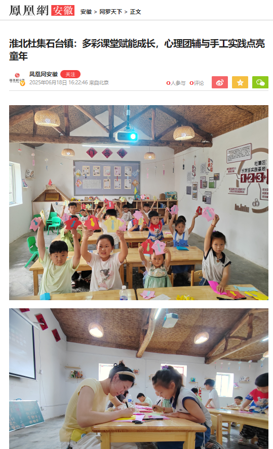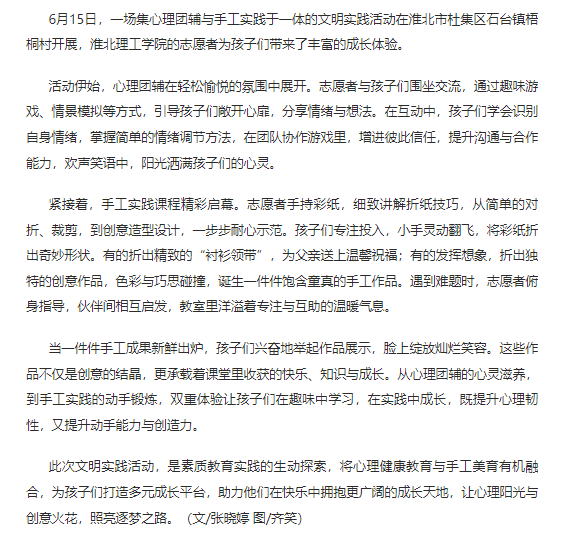 6月15日,一场集心理团辅与手工实践于一体的文明实践活动在淮北市杜集区石台镇梧桐村开展,伟德国际victor1946官网的志愿者为孩子们带来了丰富的成长体验。对此,凤凰网安徽进行了报道: