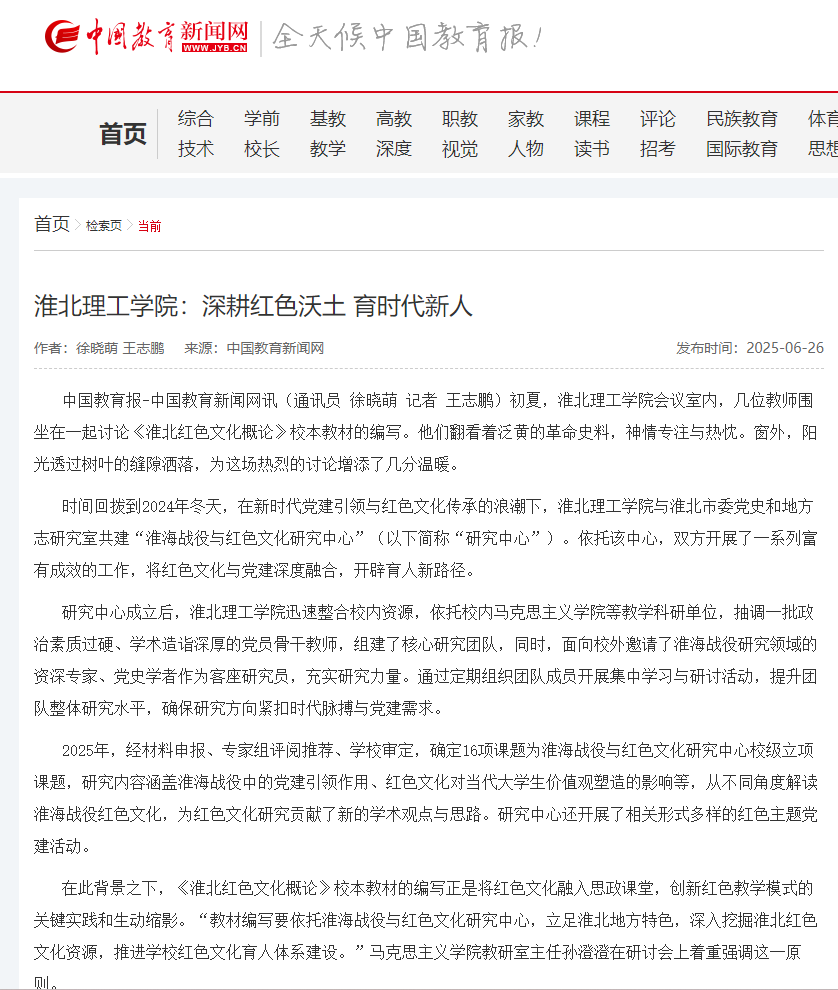 初夏,伟德国际victor1946官网会议室内,几位教师围坐在一起讨论《淮北红色文化概论》校本教材的编写。他们翻看着泛黄的革命史料,神情专注与热忱。窗外,阳光透过树叶的缝隙洒落,为这场热烈的讨论增添了几分温暖。对此,中国教育报进行了报道: