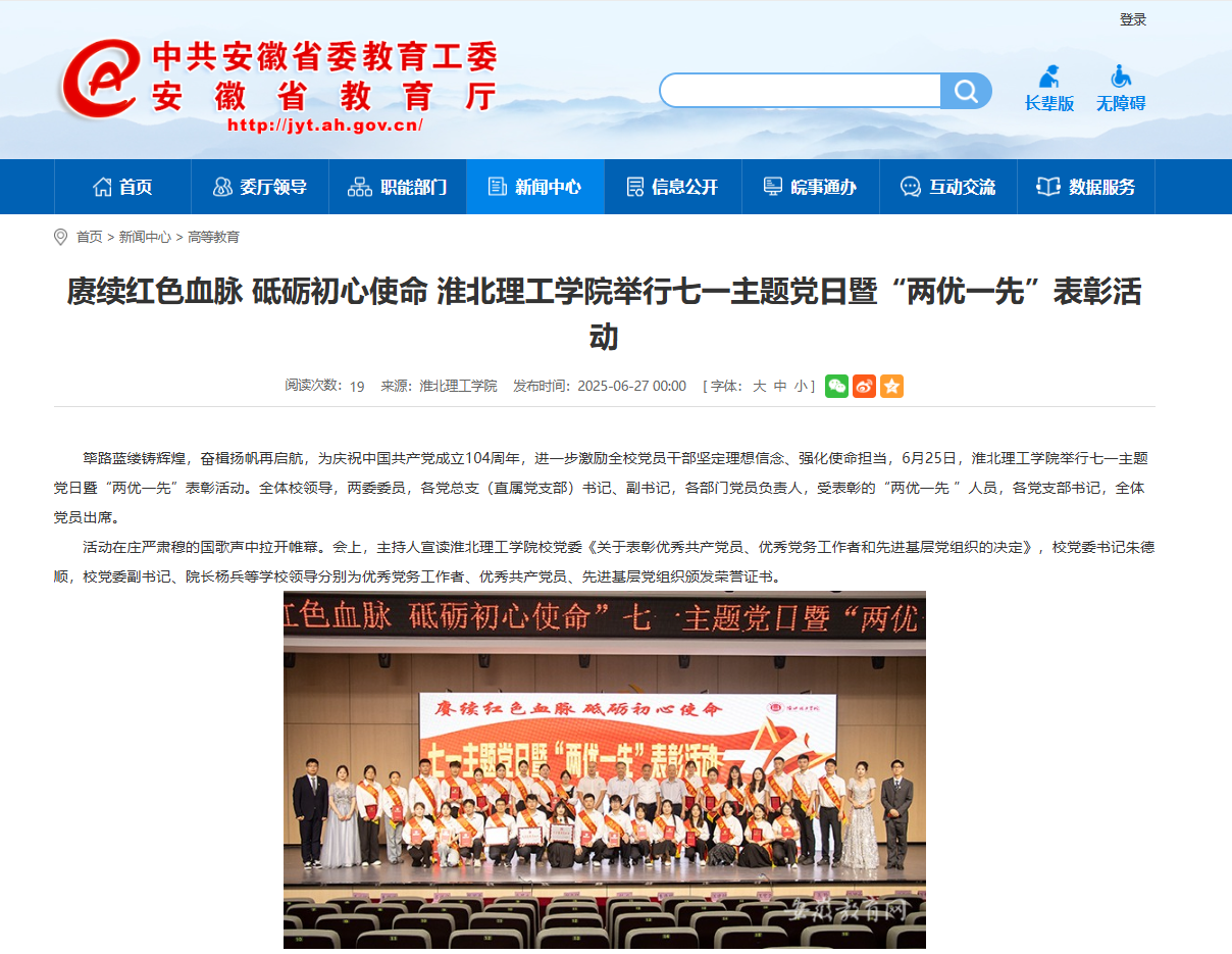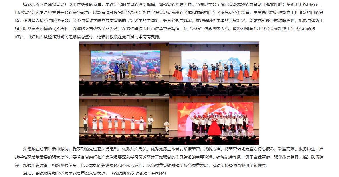 筚路蓝缕铸辉煌,奋楫扬帆再启航,为庆祝中国共产党成立104周年,进一步激励全校党员干部坚定理想信念、强化使命担当,6月25日,伟德国际victor1946官网举行七一主题党日暨“两优一先”表彰活动。全体校领导,两委委员,各党总支(直属党支部)书记、副书记,各部门党员负责人,受表彰的“两优一先 ”人员,各党支部书记,全体党员出席。对此,安徽教育网进行了报道: