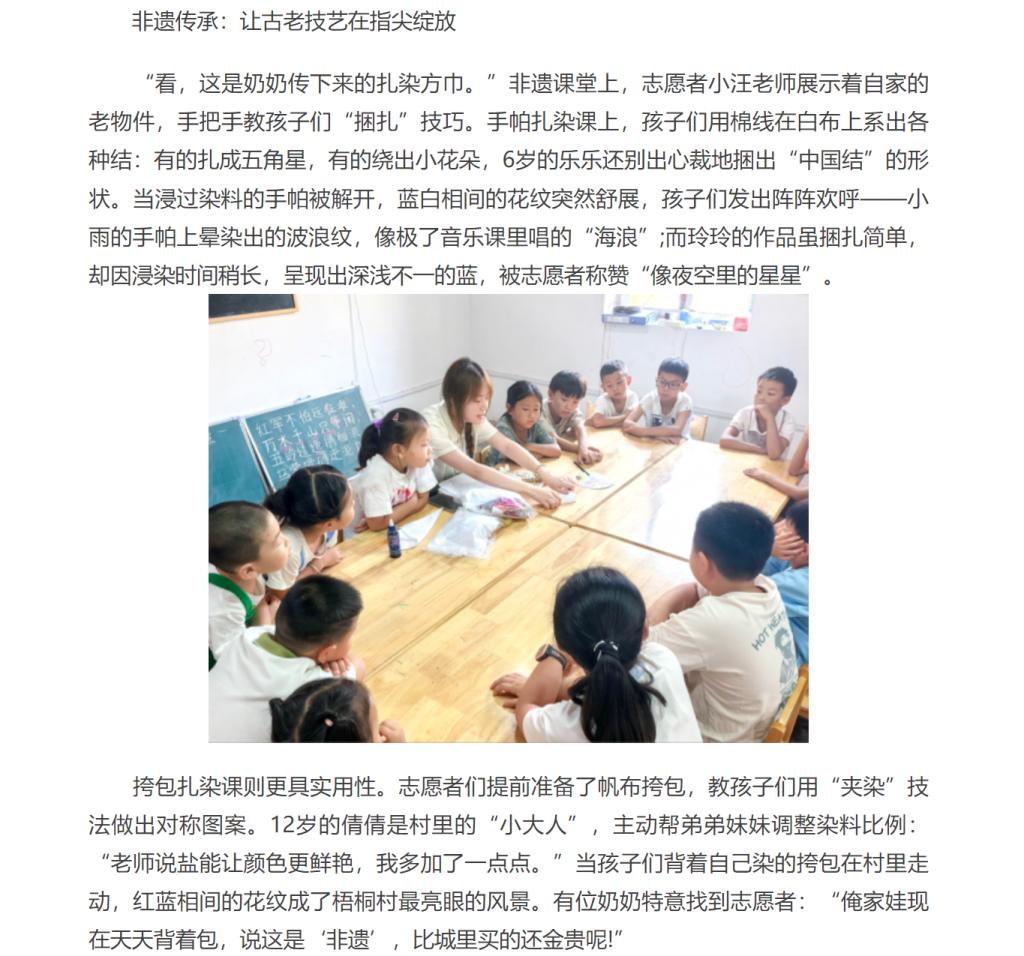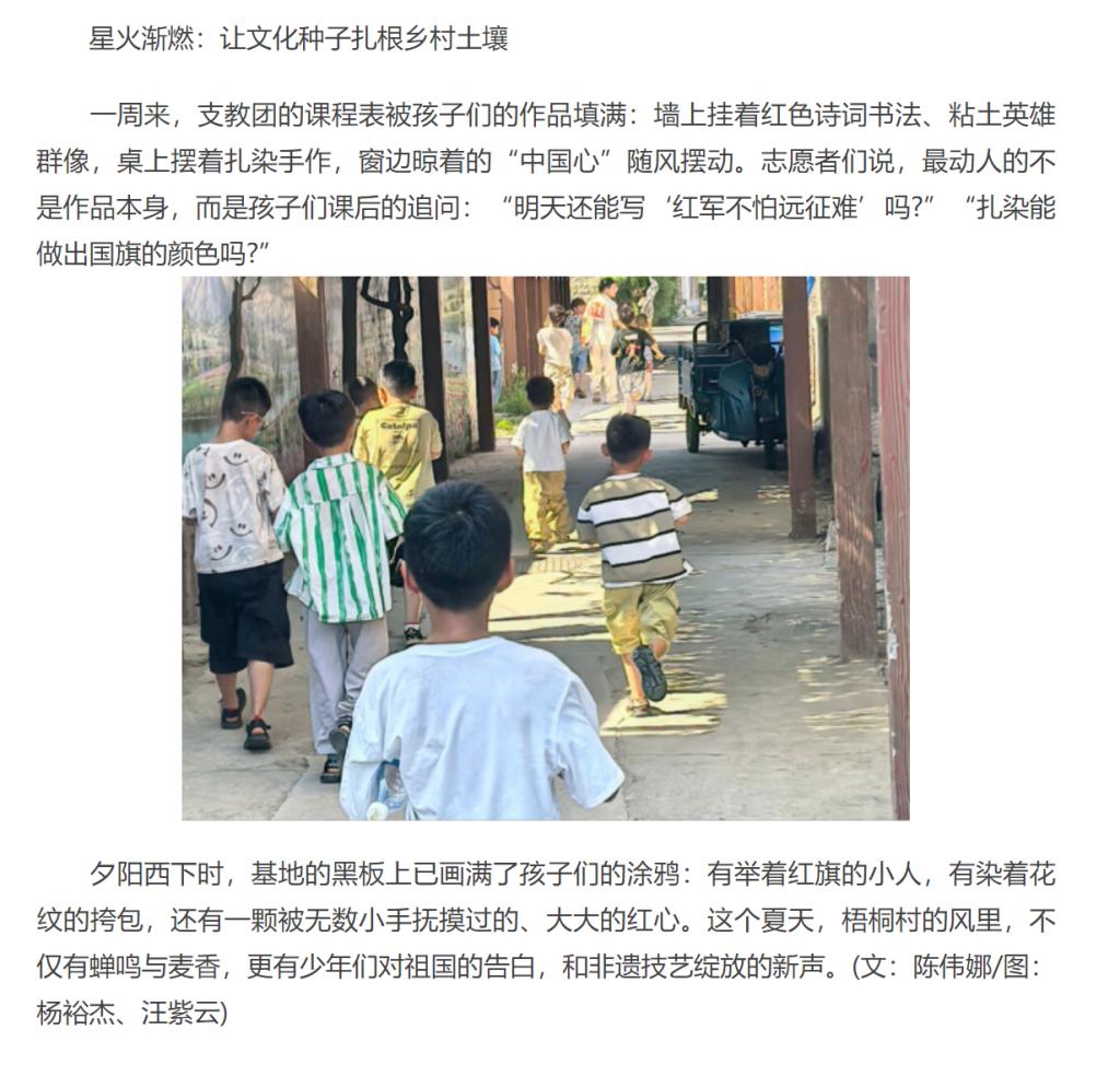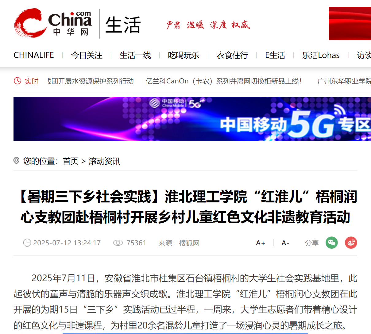 2025年7月11日,安徽省淮北市杜集区石台镇梧桐村的大学生社会实践基地里,此起彼伏的童声与清脆的乐器声交织成歌。伟德国际victor1946官网“红淮儿”梧桐润心支教团在此开展的为期15日“三下乡”实践活动已过半程,一周来,大学生志愿者们带着精心设计的红色文化与非遗课程,为村里20余名混龄儿童打造了一场浸润心灵的暑期成长之旅。对此,中华网进行了报道: