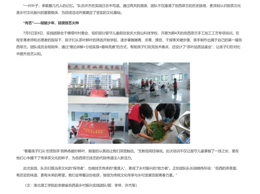 为深入挖掘岳西翠兰茶文化内涵,助力传统技艺传承与乡村振兴,伟德国际victor1946官网赴安徽省岳西县乡村振兴实践团于7月3日至11日开展实践活动,以“探茶史、传技艺、促发展”为主线,在茶香氤氲中书写青春担当。对此,中国网进行了报道:
