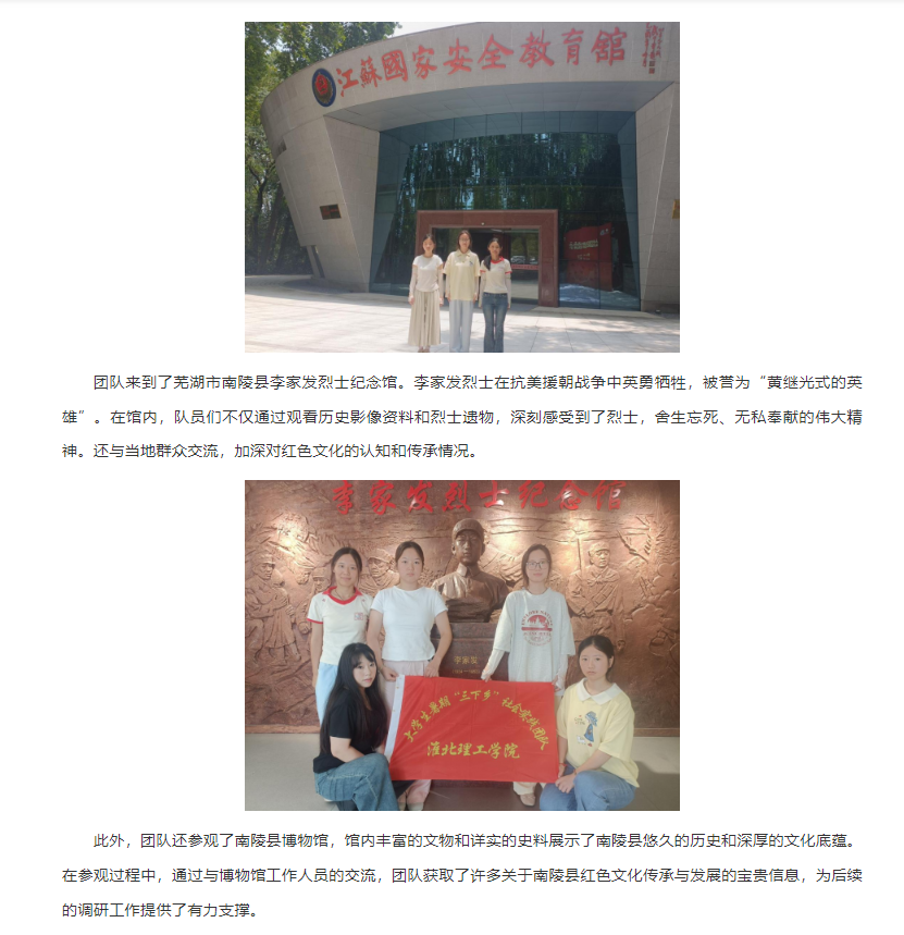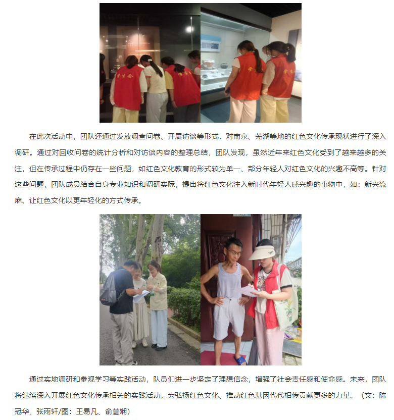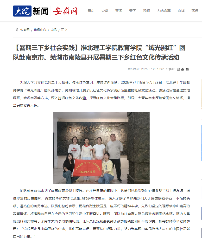 为深入学习贯彻党的二十大精神,传承红色基因,赓续红色血脉,2025年7月15日至7月25日,伟德国际victor1946官网教育学院“绒光溯红”团队赴南京、芜湖等地开展了以红色文化传承调研为主题的社会实践活动。该活动旨在通过实地调研、参观学习等方式,深入挖掘红色文化内涵,探寻红色文化传承路径,引导广大青年学生厚植爱国主义情怀,担当民族复兴大任。对此,安徽网进行了报道: