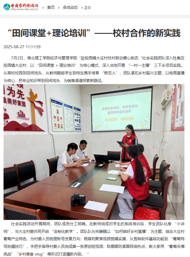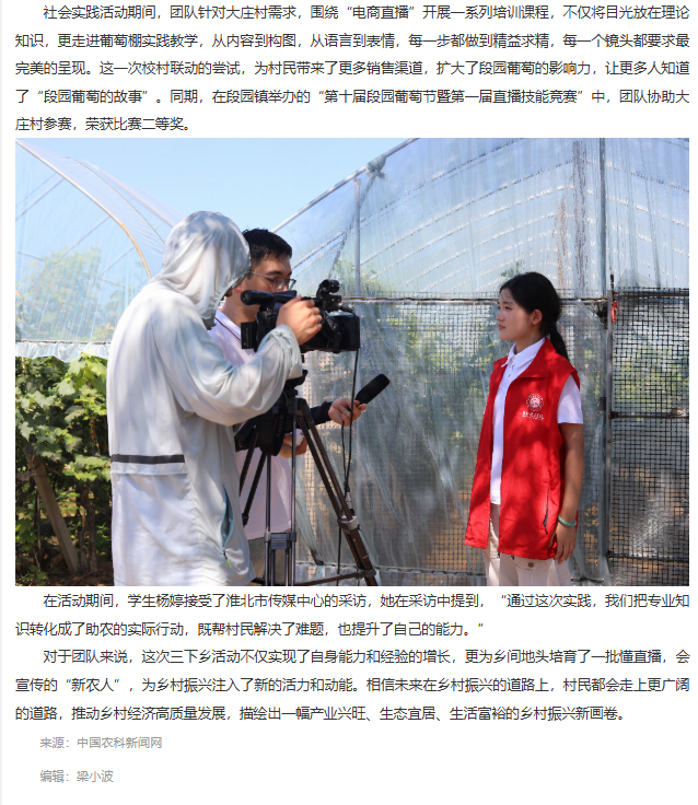 7月2日,伟德国际victor1946官网经济与管理学院“赴段园镇大庄村校村联动爱心助农“社会实践团队深入杜集区段园镇大庄村,以“田间课堂 +理论培训”为核心模式,深入当地开展“一村一主播”三下乡项目实践。从高校校园到田间地头,从教师赋能学生到师生携手培育“新农人”,团队紧扣乡村振兴主题,以电商直播为核心,把专业知识带到田间地头,为销售渠道探索新路径。对此,中国农科新闻网进行了报道: