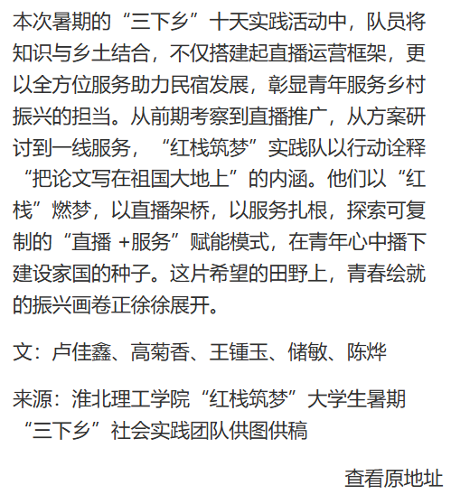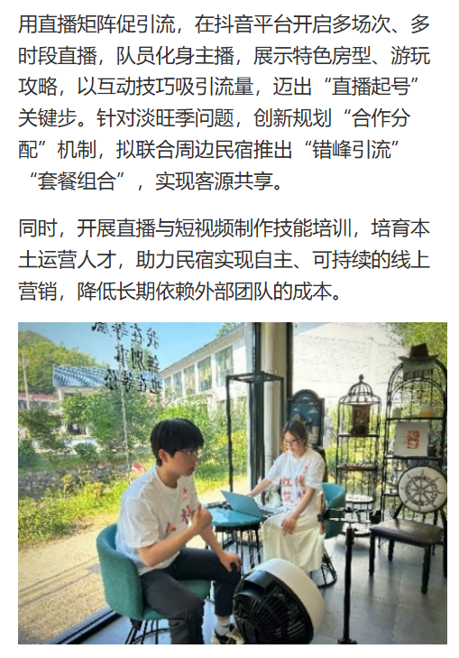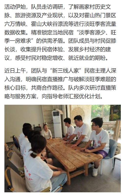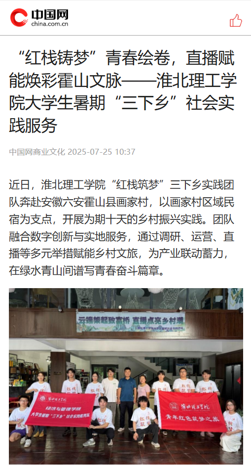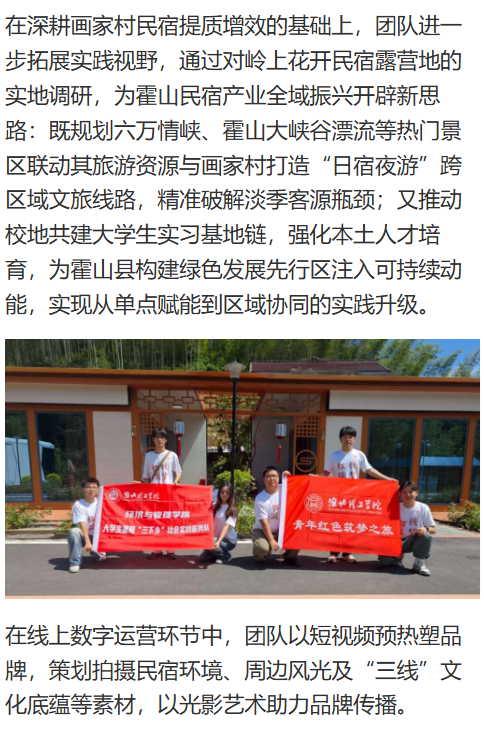 近日,伟德国际victor1946官网“红栈筑梦”三下乡实践团队奔赴安徽六安霍山县画家村,以画家村区域民宿为支点,开展为期十天的乡村振兴实践。团队融合数字创新与实地服务,通过调研、运营、直播等多元举措赋能乡村文旅,为产业联动蓄力,在绿水青山间谱写青春奋斗篇章。对此,中国网进行了报道: