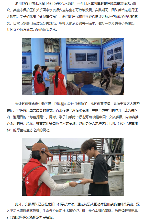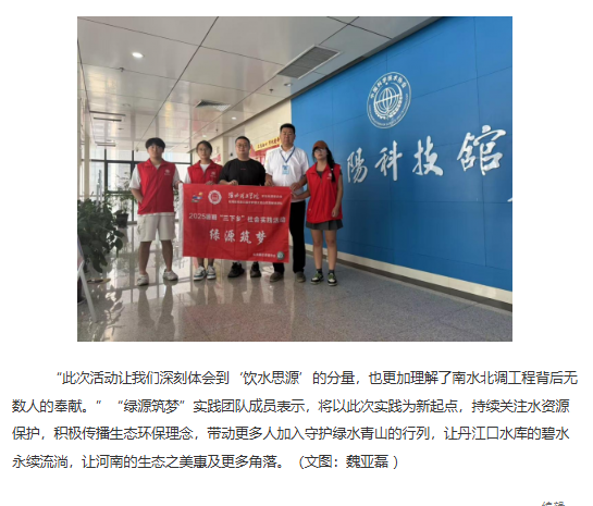 今年是“绿水青山就是金山银山”理念提出20周年,8月15日全国生态日以“绿水青山就是金山银山”为主题,凝聚全社会生态保护共识。在此背景下,8月7日至13日,伟德国际victor1946官网常青藤志愿者协会的河南籍学子组建“绿源筑梦”实践团队,奔赴河南省南阳市淅川县,开展以“守护绿水青山”为主题的暑期“三下乡”社会实践活动。学子们以实际行动践行生态理念,传承南水北调精神,为水源保护与环保宣传注入青春力量。对此,河南网进行了报道: