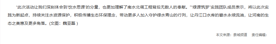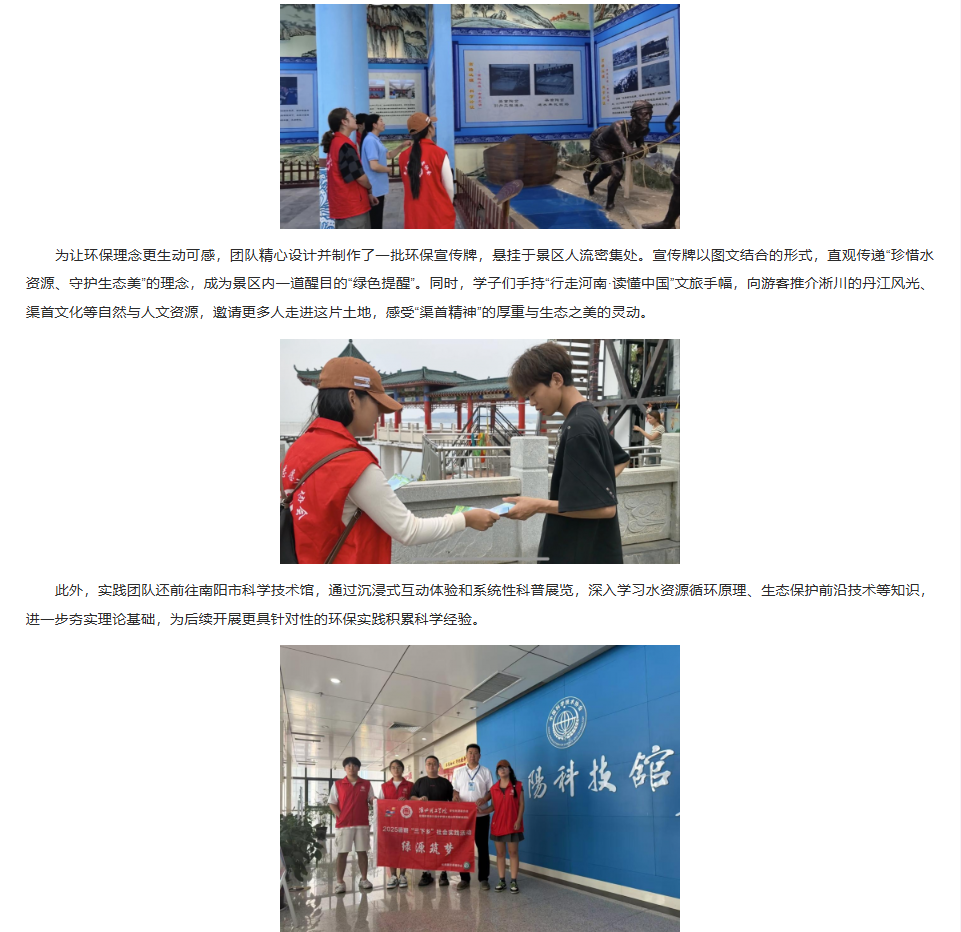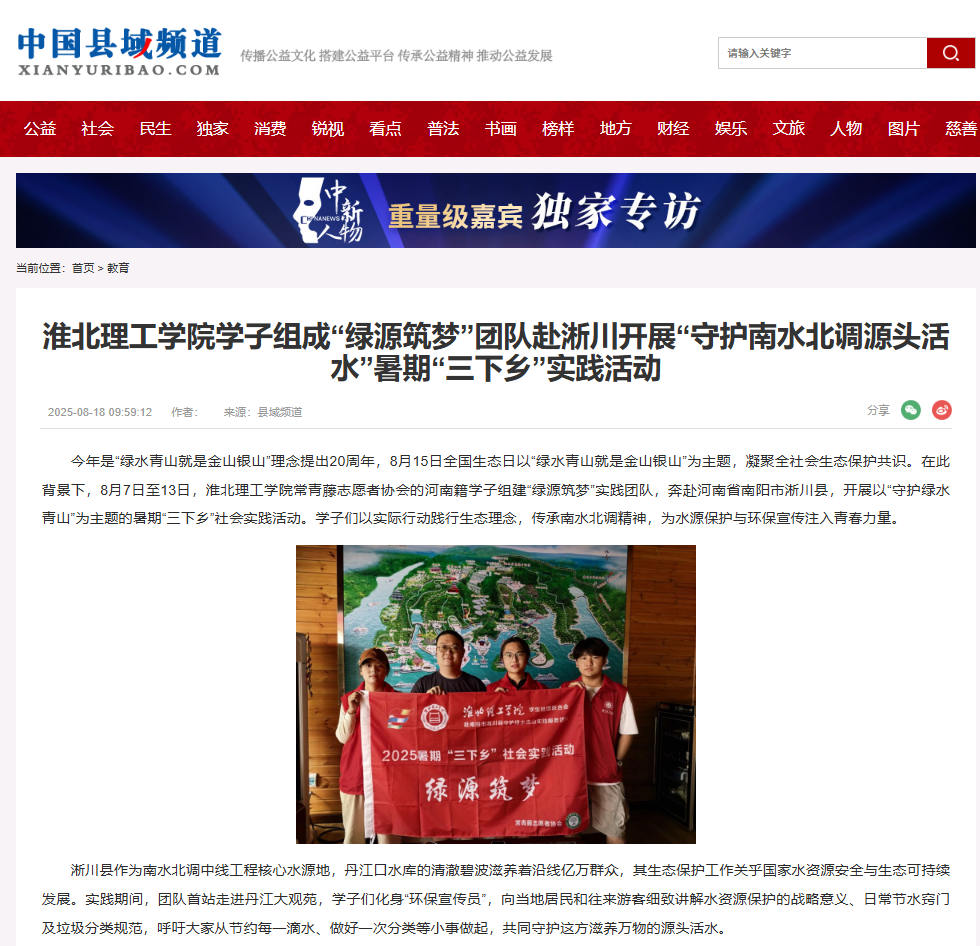 今年是“绿水青山就是金山银山”理念提出20周年,8月15日全国生态日以“绿水青山就是金山银山”为主题,凝聚全社会生态保护共识。在此背景下,8月7日至13日,伟德国际victor1946官网常青藤志愿者协会的河南籍学子组建“绿源筑梦”实践团队,奔赴河南省南阳市淅川县,开展以“守护绿水青山”为主题的暑期“三下乡”社会实践活动。学子们以实际行动践行生态理念,传承南水北调精神,为水源保护与环保宣传注入青春力量。对此,中国县域频道进行了报道: