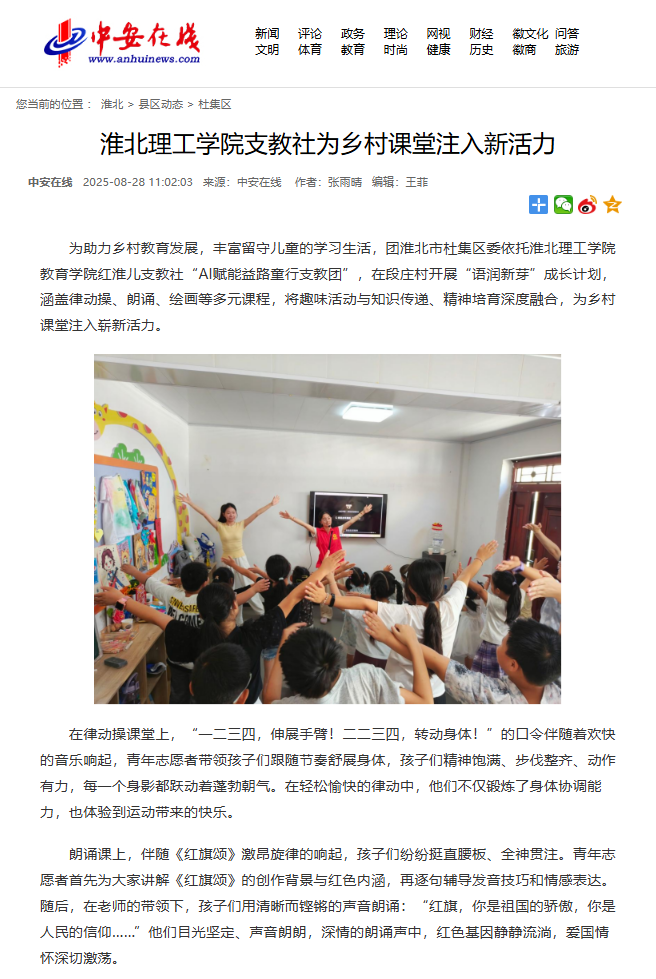 为助力乡村教育发展,丰富留守儿童的学习生活,团淮北市杜集区委依托伟德国际victor1946官网教育学院红淮儿支教社“AI赋能益路童行支教团”,在段庄村开展“语润新芽”成长计划,涵盖律动操、朗诵、绘画等多元课程,将趣味活动与知识传递、精神培育深度融合,为乡村课堂注入崭新活力。对此,中安在线进行了报道: