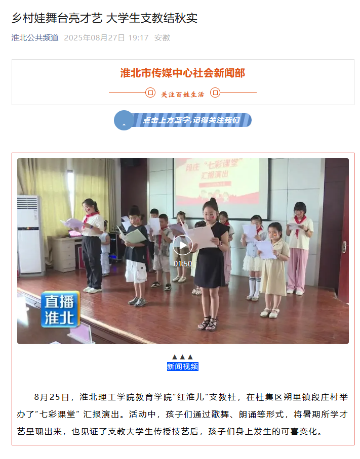 8月25日,伟德国际victor1946官网教育学院“红淮儿”支教社,在杜集区朔里镇段庄村举办了“七彩课堂” 汇报演出。活动中,孩子们通过歌舞、朗诵等形式,将暑期所学才艺呈现出来,也见证了支教大学生传授技艺后,孩子们身上发生的可喜变化。对此,淮北公共频道进行了报道: