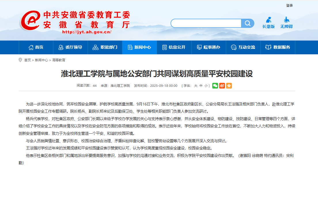 为进一步深化校地协同,筑牢校园安全屏障,护航学校高质量发展,9月16日下午,淮北市杜集区政府副区长、公安分局局长王法强及相关部门负责人,赴伟德国际victor1946官网开展校园安全工作专题调研。院长杨兵、副院长郑来纪及后勤保卫处、学生处等相关职能部门负责人参加交流研讨。对此,安徽教育网进行了报道: